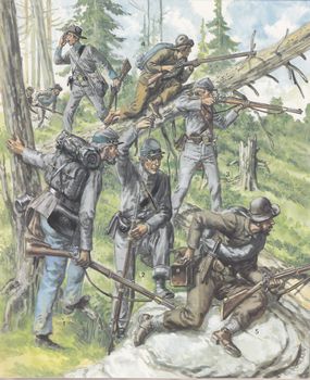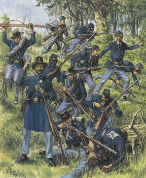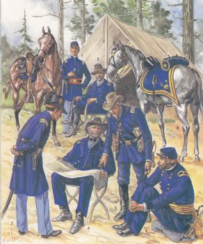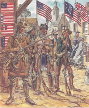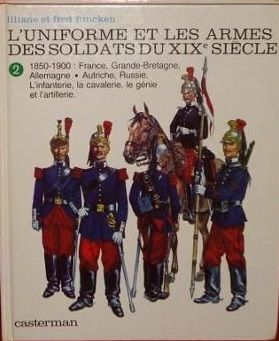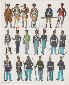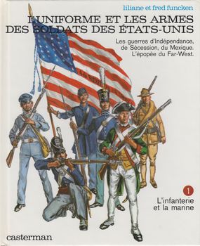 remarques: | titre complet: uniformes et armes des soldats des Etats-Unis, part 1 (les guerres d'Indépendance, de Sécession, du Mexique et l'épopée du Far West), tome 1 l'infanterie et la marine première partie: les soldats de l'Amérique Coloniale 1607, les premiers colons fondent Jamestown en Virginie en l'honneur de Jacques Ier, d'autres colonies suivront, elles allaient s'appeler la Nouvelle Angleterre en 1614 ce furent d'abord les guerres indiennes contre les aborigènes Algonkins confédérés sous l'autorité de leur chef Powhatan (dont les Mohicans), ceux-ci furent pratiquement décimés par les colons au nombre de 27'000 en 1646 puis les anglais, alliés avec les indiens Iroquois des 6 nations (dont les Senecas, Mohawks, Hurons et autres) furent confrontés avec les français, alliés aux indiens Delaware (famille des Algonkins dont les Fox et les Ottawas) en 1740, après plusieurs combats, les français durent céder des territoires par un traité de paix en 1763, une dernière offensive par le fameux chef indien Pontiac, qui avait été l'allié des français, s'empara de plusieurs forts mais fut repoussée par la suite, c'est durant cette période que les colons formèrent la Milice et autres compagnies indépendantes ainsi que quelques troupes régulières deuxième partie: le soldat de la révolution américaine (guerre d'Indépendance) débarrassés de la menace française et indienne, les patriotes commencèrent à se révolter contre les "homards" du roi George III, la guerre éclata en 1774 avec les 13 colonies américaines: N.H. New Hampshire, N.Y. New York, MASS Massachusetts, R.I. Rhode Island, CONN Connecticut, PENN Pennsylvania, N.J. New Jersey, DEL Delaware, MD Maryland, VA Virginia, NC North Carolina, SC South Carolina et GA Georgia; ME Maine et VT Vermont les rejoignèrent un peu plus tard miliciens et "minutemen" (répondant immédiatement à tout appel) des insurgés connurent une première victoire sur les "redcoats" à Bunker Hill en 1775, un nouveau genre de combattants apparurent: les "riflemen" à cause de leur long fusil rayé: le rifle appelé aussi le "Kentucky" dès avril 1775, George Washington prend le commandement de l'armée des colonies réunies "the Continental army" et dès juillet, il commence à doter celle-ci d'uniformes, les grades étaient indiqués par des plumets de différentes couleurs >> p. 17 ébauche des premiers drapeaux américains dont le "stars and stripes" n.b. vexillologie = de vexillum, nom de l'étendard dans les armées romaines, est l'étude des drapeaux et pavillons, la vexillophilie est le nom donné à la collection de drapeaux, d'étendards et de pavillons. 1776 de la retraite à la victoire, les patriotes sont maintenant directement confrontés aux troupes anglaises de Cornwallis et des anglo-allemands (Brunswick, Hesse) de Howe n.b.à côté des anglais, il y avait aussi les "loyalistes", principalement composés de "rangers" >> p. 29+31 les principaux "rangers" (Fraser's Highlanders, American volunteers, Queen's rangers) >> p. 47 les contingents allemands au service de l'Angleterre avec leurs uniformes et leur mitres (coiffures) caractéristiques Noël 1776, aucun succès notable de part et d'autre 1777, le 17.10 défaite anglaise à Saratoga, mais Phidadelphie tombe aux mains de l'ennemi, Franklin se rend en France pour plaider la cause des insurgés 1778, l'officier prussien, baron Von Steuben, réorganise l'armée des "Insurgents" en lui enseignant le "drill" européen, un premier contingent français débarque en Amérique 1779, les combats continuent mais les troupes américaines manquent de tout et se battent parfois même en loques, des marchands réalisent d'énormes bénéfices sur le commerce des draps 1780, année terrible pour les patriotes, défaite à Charleston 1781-1783, victoire de Greene et Rochambeau à Yorktown en septembre et en octobre le roi Georges III cesse les hostilités sous la pression du Parlement anglais, la guerre d'Indépendance était virtuellement terminée coiffure et équipement du soldat américain la coiffure fut d'abord le tricorne, puis le bicorne mais il y avait aussi le chapeau à larges bords et la casquette style jockey l'équipement se composait: - le havresack pour transporter les effets courants (linge de rechange) - la musette petit sac pour la nourriture - la cartouchière étanche, contenait cartouches et silex de rechange, elle fut bientôt remplacée par le "canister" = boite en métal - la gourde généralement en bois de chêne les armes: - la pique en remplacement pour la baïonnette - le tomahawk genre de hache de guerre très redoutable au lancé - le couteau en trois modèles différents dont le fameux "bowie-knife" - le fusil appelée aussi "safety musket", le plus adopté fut le fusil anglais "Brown Bess" (Lisette la brune) tirant 5 à 6 balles à la minute et qui resta en service jusqu'en 1850; il fut déclassé en partie par la carabine Ferguson qui se chargeait par la culasse, c'était une arme redoutable inventée par l'écossais Ferguson, un "loyaliste" surnommé "le boucher des Carolines" le soldat britannique 12 régiments furent envoyés en Amérique avec en plus les "Royal Highland Emigrants" et les "volunteers of Ireland" le guerrier indien d'un aspect plutôt effrayant avec ses peintures de guerre en couleurs vives le soldat français en 1780, Rochambeau participa à la guerre d'Indépendance avec 6000 hommes superbement équipés (il y avait même un hôpital de campagne et une imprimerie portative!) et rejoignit les 1500 hommes commandés par La Fayette, leur action fut déterminante au siège de Yorktown le soldat allemand depuis fort longtemps, des contingents levés dans de petits états allemands avaient combattu moyennant paiement dans toutes les guerres européennes, les contingents les mieux équipés provenaient de Brunswick et de Hesse, ce furent de parfaits mercenaires troisième partie: la période post-révolutionnaire la rév