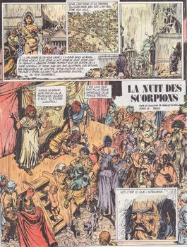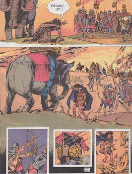 remarques: | la série est reprise par le dessinateur Franz dont le graphisme est un peu plus raffiné que celui d'Hermann fin de l'histoire de Jugurtha qui selon Salluste mourra de faim dans la prison de Tellunium, capturé par Sylla suite à la trahison de son beau-père Bocchus dans les prochains albums, la légende de Jugurtha sera développée d'une façon très fictionnelle description de Rome et de ses bas-fonds, entrée en scène de Chabrias qui prend parti pour Jugurtha après avoir été le garde du corps d'Adherbal (les raisons en sont inconnues), apparition aussi de Marius et Sylla >> p. 10 l'hercule Chabrias avec Marius et Sylla la prison de Tullianum où Jugurtha sombre petit à petit dans la folie et le plan de Chabrias pour faire évader Jugurtha >> P. 21 les rêves de Jugurtha dont celui des éléphants qui sont effrayés par des pots de feu brandis par des légionnaires (une tactique militaire?) libération de Jugurtha qui ne veut toutefois plus retourner en Numidie et qui fait venir des familles de Numidie (numides) et de Bretagne (venètes = marins expérimentés) pour rechercher de nouveaux horizons et de nouvelles terres inconnues vers l'ouest dans l'Atlantique, mais sans romains >> un bon scénario de Vernal, mais surtout un superbe graphisme de Franz qui continue la série avec élégance |