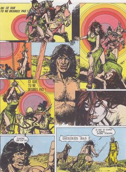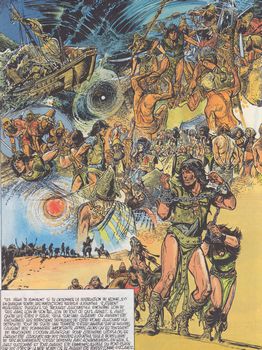 remarques: | album no 6, 46 pages, Dargaud/Lombard 1980 nouvelles pages de garde Jugurtha et Vania (embarquée à l'insu de Jugurtha) sont capturés par des pirates crétois et se retrouvent sur le marché des esclaves dans le royaume de Mithridate, roi puissant du Pont que l'on ne pouvait pas empoisonner >> p. 6 Vania la devineresse Vania est emmenée vers l'Arménie alors que Mithridate veut faire de Jugurtha le général de son armée pour combattre les légions romaines >> p. 19 Jugurtha en rêve dans le domaine des démons >> p. 24 Jugurtha qui emploie déjà le naphte comme arme de guerre Jugurtha échappe à Mithridate et part à la recherche de Vania en direction de Neapolis >> p. 31 rencontre avec l'ermite Barkou, le gardien de la steppe et de l'arbre de la flèche après s'être battu avec les scythes, les sarmates et les mongols et avoir fait alliance avec un loup, Jugurtha arrive en Chine où il retrouve Vania prisonnière >> p. 40 c'est fou ce qu'il y a comme monde dans la steppe, Jugurtha dixit >> un scénario quelque peu pêle-mêle et mystique avec une petite description de la steppe et de ses habitants, mais surtout à nouveau un bon graphisme n.b. les loups de la steppe qui suivent les armées humaines pour se rassasier avec les cadavres laissés sur place annexes - couverture de l'album - pages de garde - extraits de page |
