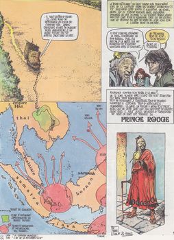 remarques: | dès ce tome 8, la parution des albums s'effectuera uniquement par les éditions Lombard Jugurtha et Vania en route pour rejoindre l'île de la résurrection (= Utopia) en utilisant le Mekong direction de la Mer de Chine, mais il faut encore traverser les territoires du prince rouge et des pirates de la Mer de Chine >> p. 13 un crime abominable: le meurtre d'un cheval rencontre avec le prince rouge, rouge de par le sang et de par la révolution causée par la terreur des hommes noirs (allusion au massacre collectif organisé par les khmers rouges), rencontre aussi avec les pirates mais Jugurtha et Vania réussiront à s'en débarrasser et à continuer leur périple >> un album plutôt banal, un scénario sans grand intérêt, mais un graphisme toujours respectable |
