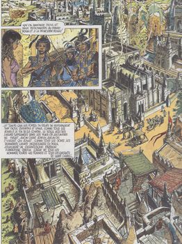 remarques: | Lombard EO 1982, 48 pages Jugurtha et Vania sur le chemin vers Utopia arrivent sur des côtes africaines et tombent sur les naufrageurs qui droguent les navigateurs arrivant dans leurs eaux (mais uniquement les mâles), Jugurtha perd la raison et avec Vania, ils sont capturés par les amazones de Wabi-Chibeli antagonisme entre Diola, chef des amazones et Borora, chef de guerre des soldats mâles >> p. 21 la cité de Wabi-Chibeli où tout le monde est triste la volonté du grand zèbre sorcier qui règne sur Wabi-Chebeli, la lutte contre les Kurdis et les Kaus qui assiègent la cité >> p. 27 l'entretien des feux qui retiennent les sauvages à distance grâce à l'herbe des zèbres = une drogue défensive Makounda, la vieille sorcière est la seule qui peut s'opposer au zèbre sorcier qui commande la cité, mais celui-ci cherche à l'éliminer et Jugurtha en sera l'instigateur (voir l'album suivant) >> p 31 l'histoire de Wabi-Chebeli >> on part dans une aventure africaine, profonde et mystérieuse, assez bien imaginée et développée, avec toujours un bon graphisme et une jolie couverture |
