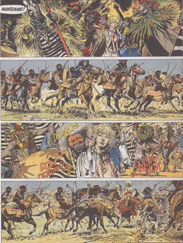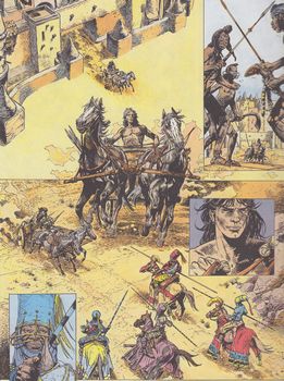 remarques: | Lombard EO 1983, 48 pages, nouveau 4ème plat la magie s'empare de Wabi-Chebeli, Riella, l'esclave grecque du grand zèbre sorcier devient la concurrente de Vania et révèle l'avenir de Jugurtha >> p. 4 un Jugurtha qui n'a plus grand chose à dire parmi toutes ces femmes la trahison du zèbre sorcier envers son peuple >> p. 15/16 à admirer: les chevaux caparaçonnés >> p. 22 le destin arrange bien les choses Diola devient amoureuse de Jugurtha, Vania est enlevée par le grand zèbre sorcier et Riella prépare l'envoûtement de Jugurtha en ramassant une mèche de ses cheveux >> p. 34/35 la belle et brave guerrière Diola Diola sauvera la vie de Vania et celle de Jugurtha alors que Makounda provoque la perte de Kora = le grand zèbre sorcier et règle ainsi une ancienne affaire avec lui (il avait tué l'amoureux de Makounda) Jugurtha a raison, mais uniquement en apparence, combat entre Somba le roi-géant des Kurdis et Jugurtha pour mettre fin au siège de Wabi-Chebeli, les adieux à Wabi-Chebeli où Diola est triste et ne peut renoncer à ne plus revoir Jugurtha >> un assez bon épisode plein de magie et qui se précise quant à l'avenir de Jugurtha qui est toujours encore décidé à terminer son voyage, à nouveau un graphisme respectable annexes - couverture Ier plat - extraits de page - couverture 4ème plat |