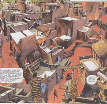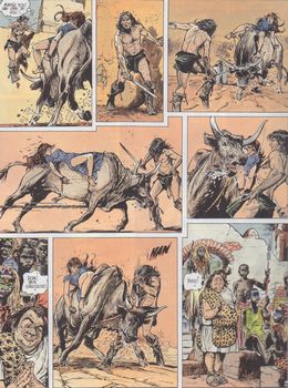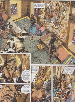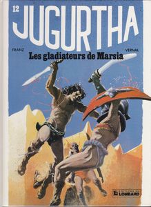 remarques: | continuant leur voyage et en se ravitaillant à une source, Vania surprend un légionnaire romain et malgré leur prudence, Vania et Jugurtha sont capturés, Vania a disparu et Jugurtha est destiné à lutter dans le cirque romain de Marsia, rencontre avec Bituit, le gladiateur gaulois >> p. 9 l'histoire de la cité romaine de Marsia en Afrique dirigée par le despote-artiste-fou Marsia n.b. à nouveau la cruauté des romains est mise en évidence Jugurtha, avant de combattre, part à la recherche de Vania, il est reconnu comme roi de Numidie par un légionnaire numide, l'esclave Aïcha de Marsia renseigne Jugurtha sur le sort de Vania, mais avant de pouvoir la libérer, Jugurtha est confronté tour à tour avec un lion, un trio de singes mandrill et finalement avec un buffle sur lequel Vania a été attachée, mais avec l'aide de Bituit et de ses gladiateurs, la tyrannie de Marsia sera supprimée >> une aventure sans grande originalité, malgré la présence des romains, toutefois assez intéressante tant pour le scénario que surtout pour le graphisme |