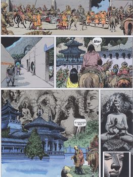 remarques: | continuation des tribulations de Timok et Yu-Lien les périples de Theodora, épouse de Kaliber Khan et reine des mongols, d'origine italienne, mère de Timok, en son temps capturée par Kaliber Khan et qui part maintenant sur ordre de Kaliber Khan à la recherche de jeunes vierges pour son pourceau d'époux plein de poux durant son voyage, Theodora est capturée par un chef de guerre chinois et c'est Timok qui partira à la recherche de sa mère >> p. 28 l'histoire de Theodora supplices chinois, castration des eunuques, amours lesbiennes et finalement arrivée de Kaliber Khan qui aidé par Timok élimine le chef de guerre chinois et récupère Theodora, la reine oubliée qui meurt toutefois durant les combats >> p. 31 le réveil des castrés >> p. 44 le mausolée bleu finalement Kaliber Khan pardonne à son fils et le réintègre dans la tribu avec sa femelle "poupée d'ivoire" >> un album toujours encore assez intéressant malgré un texte peu élaboré, mais un graphisme bien conçu |