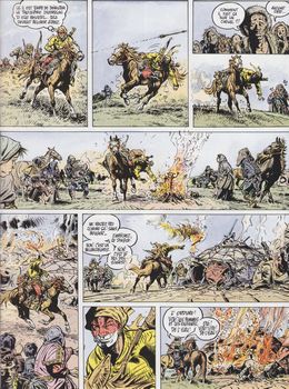 remarques: | Timok et Yu-Lien en vadrouille rencontrent le roi des singes (un ancien croisé de Venise en mission pour ramener en Occident le secret du travail de la soie par le bombyx du mûrier et qui est sur le chemin du retour) embuscades et bagarres durant lesquelles Timok est grièvement blessé, il sera sauvé et soigné par le roi des singes >> p. 15 et 33 un Timok-tout-cassé (très handicapé) >> p. 20 à 22 l'histoire du roi des singes qui a réussi à apprivoiser un singe pour lui faire dérober des oeufs de bombyx tenus au secret par les chinois >> p. 39 à 41 les acrobaties hippiques du roi des singes finalement Timok et Yu-Lien décident de suivre le roi des singes et tous les trois s'embarquent pour l'Occident >> Franz s'égare un peu avec ses singeries, un scénario désordonné et quelque peu lassant avec un texte peu élaboré, mais un graphisme toujours encore respectable |