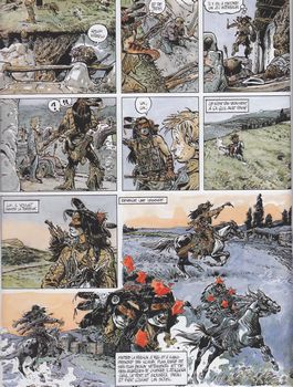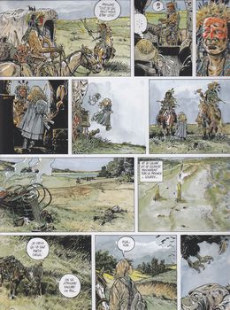 remarques: | XIXème siècle, une épopée du Far West deux familles, l'une italienne et l'autre bien sûr irlandaise sur les traces d'un convoi en route pour le Wyoming, mais déjà sur le parcours, les deux chariots sont attaqués par des peaux-rouges Pawnee, il n'y aura que deux survivants: le jeune Llogan Jubal et le vieux Pepe Giuseppe ainsi que deux petites filles, Sharon la blonde et Lucia la brune, qui ont été enlevées par les Pawnee chez les Sioux, Salmon Leap (le bond du saumon) s'est vu refusé la main de Foggy Dew (goutte de brume), il quitte alors sa tribu pour partir mourir en brave, mais il tombera sur la petite Sharon (la poupée aux cheveux de soleil), prisonnière des Pawnee, il réussira à la délivrer et elle deviendra sa grande petite amie >> p. 8/9/10 l'attaque des Pawnee >> p. 22 la grande parure de Salmon Leap après avoir mis en sécurité le vieux Giuseppe à Eagle Point Creek, Llogan Jubal décide de se mettre à la recherche des deux fillettes, durant ses recherches, Jubal rencontrera Sharon et par son entremise fera la connaissance de Salmon Leap, les deux ennemis traditionnels sympathiseront et partiront tous les deux à la recherche de Lucia après avoir laissé Sharon à la garde d'une généreuse famille irlandaise qui dorénavant sera protégée par la tribu sioux de Salmon Leap longtemps plus tard, Jubal découvre Lucia, mais il est capturé par les Pawnee et mis au poteau de torture, toutefois il sera délivré par Salmon Leap et ses frères sioux mais il sera trop tard pour récupérer Lucia qui est déjà devenue une véritable femme indienne alors que Sharon un peu plus tard deviendra l'épouse d'un brave fermier irlandais et reconnaîtra à peine ses deux vieux amis alors Jubal et Salmon Leap qui a pris le nom de "Two Crows" décident de mourir ensemble selon la tradition sioux en chargeant leurs ennemis >> p. 59 le supplice de Jubal chez les Pawnee >> 68 les dernières paroles des deux amis avant de chevaucher la mort: "tu crois que nous pourrions encore être utiles?", réponse: "j'en suis persuadé, mais je suis quand même prêt" >> Franz, pour une de ses dernières oeuvres, renoue avec les chevaux en produisant une fresque western, humaine et pathétique, genre "danse avec les loups" et en créant une amitié solide entre un blanc et un rouge grâce à l'entremise d'un enfant (message d'espoir anti-raciste?), un bon texte plutôt original avec de sublimes illustrations pour cet album de 68 pages >> à noter: le style remarquable de Franz et les magnifiques couleurs de son graphisme et où les flèches volent vites et précises Information Franz (Drappier) est un auteur connu, des titres comme Lester Cockney, Thomas Noland (avec D.Pecqueur), Poupée d'Ivoire, démontrent sa belle notoriété dans toutes ses histoires, qu'il soit seul ou accompagné d'un scénariste, on sent vibrer dans son trait, dans son propos, une émotion, une sincérité finalement assez rares en bandes dessinées, ici, dans ce western pathétique et graphiquement superbe, où se mêlent toutes les grandes influences cinématographiques du genre, il se laisse complètement aller à sa vraie nature et ce n'est plus du bon Franz qu'il nous donne à lire, mais du très grand Franz |