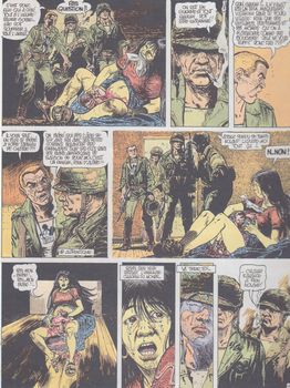remarques: | en route pour la guerre du Vietnam, Thomas Noland se souvient: l'histoire de la famille irlandaise Noland dont l'ancêtre Telemachus Noland apporta la poisse en émigrant en Amérique au début du XXème siècle en devenant chercheur d'or il tombe sur une bande de gringos à la poursuite d'une jeune femme que Telemachus sauve de leurs pattes, Anne apportera au vieux Telemachus le grand amour et lui donnera un fils: Timothy à la mort du père, Timothy quitte sa mère pour faire fortune et devient riche comme as du poker mais un jour il tue (pratiquement en légitime défense) un autre joueur et est malgré tout condamné à 10 ans de bagne toujours en jouant du poker avec le directeur du bagne, Timothy s'attire les faveurs d'Anna, fille du directeur qui l'aide à s'évader; échappé, Timothy laisse néanmoins tomber Anna qui, reprise par son père, se suicidera >> p. 21 la belle Anna dénudée et délaissée Timothy reprend son activité au poker à Chicago où il fait la connaissance de la jolie Mary et de son compagnon Charlie, hélas Mary meurt peu après renversée par une Cadillac blanche lancée à tout allure, Timothy jure de la venger plus tard, Timothy découvre la pulpeuse Sugar Love, son deuxième amour, actrice-strip-teaseuse au Cotton Club de Chicago >> p. 33 la sensuelle Sugar Love mais de ce fait, il s'attire la haine du capo Scalizi, épris de Sugar Love et qui envoie ses tueurs sur Timothy, celui-ci réussira à éliminer les tueurs tout en découvrant qu'ils étaient ceux qui ont tué Mary avec la Cadillac blanche par cette action, il reçoit l'admiration de Don Alberto, le parrain de la mafia de Chicago qui oblige Scalizi à faire la paix avec Timothy 1925 mariage de Timothy avec Sugar Love qui lui donne un fils: Trevor >> p. 38 la vie somptueuse de Sugar Love et de Timothy devenu un caïd de la mafia de Chicago retour à la guerre du Veitnam où Thomas, fils de Trevor, participe à l'anéantissement d'un village vietnamien où se déroule un épouvantable carnage >> p. 42 la survivante qui met au monde un enfant durant le carnage et qui est abattue par le sergent de Thomas mort aussi de Mickey, le compagnon d'arme de Thomas et son histoire avec le père Noël >> récit d'un nouveau genre, autobiographie de la famille Noland, une histoire brutale, pathétique et affreusement humaine avec un superbe graphisme de Franz qui pour une fois délaisse ses chevaux en illustrant un drame poisseux de société annexes - couverture 1er et 4ème plat de l'album - planche extraite du récit - réédition de 1996 Information Thomas Noland est une série de bande dessinée historique dessinée par le belge Franz et écrite par le français Daniel Pecqueur, publiée à partir d'octobre 1982 dans Charlie Mensuel, elle a fait l'objet de cinq albums édités entre 1984 et 1998 par Dargaud cette série "ambitieuse" retrace l'histoire des États-Unis au XXème siècle à travers Thomas Noland, un soldat américain envoyé combattre au Viet-Nam, son père Trévor, son grand-père Timothy et son arrière-grand-père Télémachus |