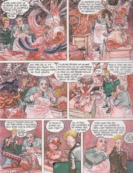 remarques: | satires sur la société humaine en plusieurs sketchs (ou saynètes): - aventures en Malaisie - la loi du Grand Nord - conte de la Bretagne profonde - les parias de la nature - jeux de muscles, jeux de viluscles - la solitude des profondeurs - le tigre du Bengale - l'écorché-vif - Leonardo - les sauvages sont des primitifs - intimité n.b. viluscle = villosité = saillie filiforme (filiforme = mince comme un fil) qui donne un aspect velu à une surface (les villosités intestinales) dont les meilleurs: - la loi du Grand Nord - jeux de muscles - l'écorché-vif - intimité >> p. 60 le baiser selon Boucq >> fumez c'est du Boucq, un nouveau genre avec un bon boucquet, 11 nouvelles délirantes, en partie très bonnes, mais surtout un superbe graphisme particulier à Boucq Information >> dans ce même genre "humour noir", voir Jerôme Macherot et aventures de la mort |