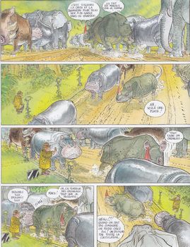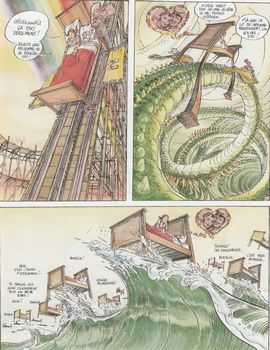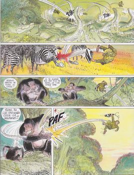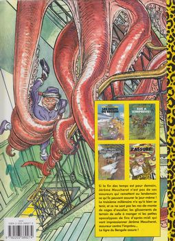 remarques: | les aventures de Jérôme Moucherot, alias tigre du Bengale, alias agent d'assurance, continuent, mais ne s'améliorent guère, toutefois les gags sont meilleurs que le récit complet du premier volume (78 pages) et ce quatrième album n'aura que 56 pages de nonsense divers gags axés principalement sur les assurances: - pâle reflet - retour à la genèse des origines du commencement de l'assurance - dont là, où l'assurance prend ses racines = l'arbre de l'assurance-vie éternelle, - les premiers assureurs - le charme du risque et de l'imprévu - le prophète du multirisque, etc - petite méditation sur les chambardements du chaos - le quantique des quantiques - contrat du 3ème type - le rock du potager - les joyeuses fées de l'assurance - troubles circulatoires (dont les hippo-mobiles, modèle en voie d'extinction) - le tigre du Bengale assure un max - petit verre dans un rêve d'eau >> p. 43 une zone de dépression post-natale à la naissance des hippocampes + référence à Little Nemo in Slumberland - la compagnie "le rire assuré" avec l'assurance humoristique (n.b. pages 50 et 51 interverties) - le millénaire à bout >> p. 13 Rollex au lieu de Rolex (mais peut'être intentionnel pour ne pas chatouiller la marque) >> p. 23 la théorie du chaos nomenclature - ascèse 1/ ensemble d'exercices physiques et moraux destinés à libérer l'esprit par le mépris du corps en vue d'un perfectionnement spirituel ou moral 2/ privation voulue et héroïque - hasbeen = anglicisme désignant un individu qui, s'il fut célèbre à un moment donné, est passé de mode et n'est plus au goût du jour, une ancienne gloire >> critique et humour sur l'assurance, un album à la Boucq-en-train avec quelques bon sketchs et un graphisme respectable dans son genre n.b. il existe encore dans ce genre quatre autres albums de la série: - tome 2 sus à l'imprévu (1998) - tome 3 le péril pied-de-poule (1998) - tome 5 le manifeste du mâle dominant (2012) - tome 6 une quête intérieure, tout en extérieur, histoire de ne pas salir chez soi (2019) mais non collectionnés ici annexes - couvertures 1er et 4ème plat - extraits de l'album dont le dernier, genre Little Nemo à la sauce Boucq |