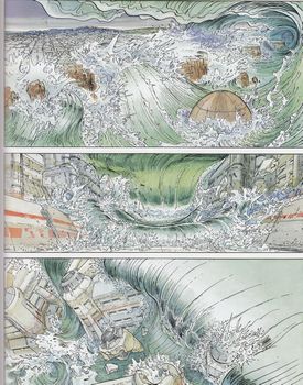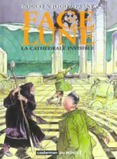 remarques: | 1er tome de 108 pages sur les aventures de Face-de-Lune, le dompteur de vagues et personnage mi-humain, mi-dieu la cité marine de Damanuestra est continuellement menacée par des tempêtes et des vagues énormes qui en résultent, la cité est gouvernée par le kondukator Oskar et la kondukatrice Lili avec l'emblème de l'oeuf ainsi que par un groupe d'aristo-ecclésiastiques, mais un mystérieux clochard, Face-de-Lune, se joue des éléments et perturbe la vie de la cité >> p. 12 le kondukator qui gouverne la république démocratique ovarienne de Damanuestra >> p. 18-22 les vagues énormes qui menacent Damanuestra Borrado, alias Face-de-Lune et Sisha, son amie essaient aussi d'empêcher la chasse cruelle au Teohuacan = genre de baleine chassée par les pêcheurs de Damanuestra >> p. 40/41 la cérémonie de la reproduction sur la vierge immaculée et en catalepsie par le vainqueur des vainqueurs le kondukator ordonne de s'emparer de Face-de-Lune, mais celui-ci est invincible >> p. 59 excommunication, les troupes d'élite du kondukator perdent la trace de Face-de-Lune et d'Isha qui s'enfuient dans le centre de la terre, lors de leur fuite, Face-de-Lune et Isha sont arrêtés par les Niktamères, rebelles de l'intérieur, Face-de-Lune subit l'épreuve de la broyeuse entretemps, la révolte est totale sur Damanuestra et après s'être débarrassés des Niktamères, les deux fugitifs trouvent refuge dans le bordel de la grosse Lola >> p. 66 l'histoire des origines de Damanuestra >> p. 81 la grosse Lola et son fils Seraphino finalement Face-de-Lune est capturé par la milice ecclésiastique, mais une grande vague arrivée subitement le remet en liberté et lui fait découvrir la cathédrale invisible, Face-de-lune avec Isha et un vieux moine entreprennent de la reconstruire >> après l'épisode de la vague, on nous annonce l'épisode de la montagne , mais le tome 2 ne sera publié que 5 ans après >> un album mystique et original avec un joli graphisme, toutefois le scénario au style très complexe et même un peu berzingue de Jodorowsky présente un message d'espoir, malgré le pessimisme ambiant à noter: - un Face-de-Lune sans visage humain et qui ne parle jamais, mais qui communique à l'aide de jeux de ficelle n.b. cette première édition a connu de nombreuses rééditions (voir annexe) annexes - couverture Ier et 4ème plat - deux couvertures de réédition en deux tomes a) titré le dompteur de vagues (2003) b) la cathédrale invisible (2003) - extraits de page - page de garde: la montagne |
