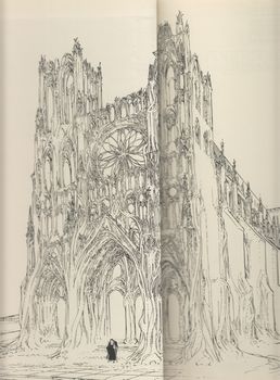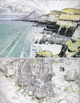 remarques: | album de 88 pages, cartonné Face-de-Lune veut aider à la reconstruction de la cathédrale détruite par les kondukators et pour ce fait réactive le phare grâce au tube de totrane dérobé lors de sa libération, une foule de pélerins se dirigent alors vers la cathédrale >> p. 9 le poussinet kondukator et ses hémorroïdes Isha apprend de Face-de-Lune que Ushman, le chef des troglodytes, est en fait une femme et la mère d'Isha Face-de-Lune part avec Isha vers la montagne qui contient des colonnes rocheuses semblables à des piliers de cathédrale qui ont l'impression de bouger par l'action des fourmis qui la peuplent et avec la mer à qui Face-de-Lune commande, les pierres de la montagne sont transportés par les vagues vers le lieu de construction de la cathédrale à Damanuestra, les ecclésiastiques reprennent le pouvoir et castrent le kondukator en lui faisant manger une de ses couilles >> p. 31 une planche explicite de son côté, Face-de-Lune reconstruit la cathédrale à l'aide de plantes grimpantes >> p. 36/37 les colonnes de pierre qui poussent comme du chiendent tandis que les Swingniks déguisés en soldats du kondukator violent et dérobent le sanctuaire de la sainte vierge, pour se venger, le peuple des troglodytes montent à l'assaut du palais kondukatorial, le kondukator est tué et les nouveaux chefs s'entretuent lors de combats acharnés >> p. 58 la couveuse kondukatoriale >> p. 60 des visages affreux de combattants durant le combat des chefs, mort d'Ushman, l'histoire d'Ushman au bordel de la grosse Lola, son fils Seraphino se prend pour l'envoyé de Dieu et pour le nouveau messie tandis que la cathédrale reconstruite est détruite par un tremblement de terre, mais reconstruite derechef lorsque la sainte-vierge récupérée par Face-de-Lune disparait à son tour et remet un dernier message aux constructeurs: "je suis la pierre de faîte, vous pouvez toujours construire, sans moi rien ne tiendra en place" Face-de-Lune et Isha partent alors à la recherche de la pierre de faîte, car sans elle, en vain peineront les bâtisseurs >> cet album n'est pas seulement une parodie anti-cléricale et sociale, complexe et irrationnelle, c'est aussi une orgie d'illustrations et de couleur superbement maîtrisée par le dessinateur-bâtisseur Boucq annexes - 1er et 4ème plat de l'album - couverture de la réédition: la femme qui vient du ciel (2004) - extraits de page - page de garde: la cathédrale |