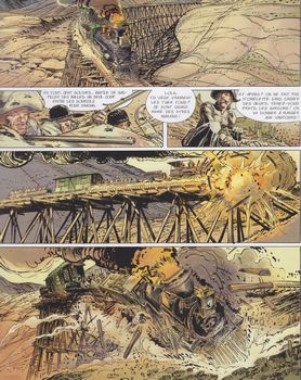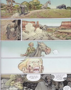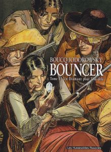 remarques: | 2ème édition originale (octobre 2001, EO = juin 2001) guerre de Sécession, un déserteur est ramené chez le capitaine confédéré Ralton qui continue la lutte malgré la reddition sudiste devant Sheridan, la bande de Ralton se transforme en pillards, puis se disloque, Ralton reste un bandit de grand chemin avec quelques uns de ses lieutenants Seth, fils de Blake, un ancien pistolero devenu pasteur, découvre une momie dans un ancien village navajo, alors que Ralton revient chez son frère Blake pour rechercher un diamant laissé par leur mère, mais que Blake ne peut lui donner >> p. 24 le massacre dans la ferme de Blake Seth, seul survivant, part à la recherche de Bouncer, frère de Blake et de Ralton, tueur professionnel manchot à Barro City et videur officiel du saloon "el infierno", Bouncer deviendra le protecteur et l'instructeur de Seth qui veut maintenant venger ses parents >> p. 37 il vaut mieux perdre la tête plutôt qu'un bras, les morts ne souffrent pas, les manchots souffrent toute leur vie >> p. 38 la sépulture de Blake et de sa femme l'histoire du diamant "oeil de Caïn" et celle de Aunty Lola, la pute grand-mère de Seth, Lola et ses 3 fils décident de dérober le diamant lors de son transport par train blindé, ils y arriveront, mais par la suite, ils s'entretuent pour la possession du diamant et Aunty Lola, dégoûtée, se pend après avoir caché le diamant alors que durant la bagarre Bouncer perd son bras droit et Ralton son oeil droit (l'oeil de Caïn?) >> p.44 une vache de plus dans le troupeau malodorant de Charles Goodnight, propriétaire de mines et d'immenses troupeaux de vaches >> p. 46 l'attaque du train l'histoire de la fusillade entre frères de sang >> p. 53 le bras de Bouncer jeté aux vautours après coup, Ralton et ses hommes sèment la terreur, alors que Seth et Bouncer partent à la recherche de Crazy Butterfly, un ancien pistolero qui doit achever l'instruction de Seth >> un western noir, cru et cruel teinté d'orgies et de sang avec un scénario solide et original, mais surtout un graphisme sublime de Boucq, très bon début de série pour cet album avec une jolie couverture d'album Information le bouncer (= videur en anglais populaire) est un manchot qui s’occupe de la sécurité au saloon l'Infernio, malgré son handicap, c'est un redoutable tireur, lorsque son neveu, devenu orphelin, lui demande son aide, cela l'amène à renouer avec un passé douloureux, ses deux frères et lui sont les enfants bâtards d’une prostituée itinérante avec laquelle ils ont commis nombre de méfaits, le dernier ayant conduit à la dislocation de la famille: en se disputant un diamant, l'un s’est retrouvé borgne, l'autre manchot et la mère s'est suicidée, depuis, l'aîné est devenu pasteur, le bouncer a trouvé protection auprès d'El Diablo, son mystérieux employeur et le troisième est resté hors-la-loi les tribulations du bouncer l'amèneront à élucider la série d’assassinats de notables de la ville, tous tués par une morsure de serpent (le coral verde) |