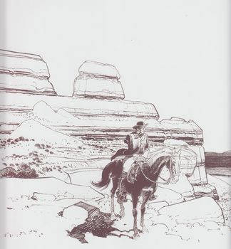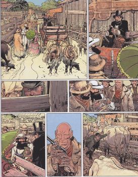 remarques: | à noter: 2 pages de garde magnifiques ajoutées genre ex libris au volume, pages de garde qui ne seront reproduites que dans les albums 7 et 8 le bourreau de Barro City meurt mordu par un serpent "coral verde", Bouncer participant au jugement d'Ogre Jim, un assassin d'enfants, est désigné pour remplacer le bourreau = le métier le plus méprisé du Far West d'un autre côté, le richissime rancher Clark Cooper et sa pute Mara Mars cherchent à acquérir le saloon "infierno", mais sont éludés par le propriétaire "lord Diablo", ils jurent de se venger >> p. 9 l'exécution de Ogre Jim Clark Cooper engage alors une bande de tueurs dirigés par la brute Garrack pour semer la terreur dans le saloon "infierno" défendu par Bouncer >> p. 22 à 26 la bagarre dans le saloon qui mérite bien son nom d'infierno Bouncer repousse les tueurs, mais Garrack réussit à s'enfuir, peu après le propriétaire "lord Diablo", mourant, lègue son saloon et sa fortune à Bouncer qui accepte la légation et offre à la barmaid Noémie de l'épouser, toutefois un peu plus tard, Noémie retrouve son ancien amour, le noir Tom, et quitte Bouncer qui sombre dans l'alcool entretemps, le maire de Barro City est éliminé à nouveau par un "coral verde", c'est la vengeance d'un chef indien dont la tribu a été anéantie par une bande d'assassins originaires de Barro City >> p. 40-42 l'histoire de Noémie et du noir Tom finalement Bouncer revient à une vie normale grâce aux bons soins de la jeune chinoise blanchisseuse Yin Li qui tombe amoureuse de lui, mais Bouncer doit faire façe à une nouvelle épreuve, Noémie et Tom ont été faussement accusés par Clark Cooper d'avoir assassiné l'un des fils de Cooper et c'est Bouncer comme bourreau qui doit les exécuter par pendaison Bouncer est toutefois convaincu que Noémie et Tom sont innocents, il refuse de les exécuter et demande une revision de leur procès, c'est alors que le sheriff et ses hommes obligent Bouncer à effectuer son oeuvre en le saoûlant et en lui faisant fonctionner lui-même le mécanisme de pendaison, Noémie et Tom serojt donc pendus bel et bien, mais Bouncer jure de les venger et part à la recherche de Clark Cooper et de sa bande après s'être occupé du chien de Tom, amputé lui aussi d'une patte (voir >> p. 35) >> un western à nouveau dur et noir, peu de texte, mais un récit toujours bien conçu dans un univers monstrueux et oppressant avec toujours le graphisme impeccable et particulier de Boucq annexes - couverture 1er et 4ème plat - extrait de page - page de garde |