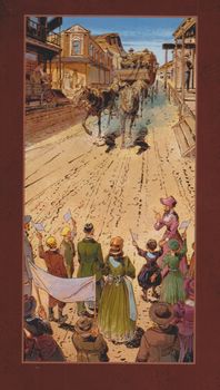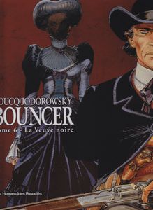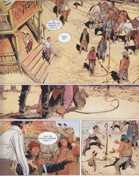 remarques: | arrivée de la nouvelle institutrice à Barro City, rencontre aussi du chef canache Toro negro avec le capitaine Gallagher, des tuniques bleues, vainqueur de Toro Negro lors des guerres indiennes Toro Negro par l'entremise de son champion Oso Loco lance un défi à Bouncer afin qu'il puisse s'affirmer comme véritable chef des canaches >> p. 12/13 le duel sous les yeux horrifiés de la nouvelle institutrice >> p. 15 Bouncer aux bains chinois apprend que la mère de Yin Li l'a obligée de se marier avec un chinois entretemps, Gallagher livre de l'alcool aux indiens canaches pour mieux pouvoir les supprimer et Barro City est maintenant confrontée à un nouveau problème: une veuve richissime s'est mise en tête de devenir la maîtresse de toute la province en rachetant les terres et elle veut aussi s'accaparer les terres des indiens canaches avec l'aide de Gallagher et du truand Axe-Head (dont un fer de hache est resté planté dans sa tête) >> p. 23 le dénommé Axe-Head >> p. 28 l'attaque du camp canache avec deux catlings (décidément Jodorowsky aime bien ces mitrailleuses), seuls Bouncer et Sakajawea, fille de Toro Negro, réussiront à s'échapper par un puit donnant dans une rivière souterraine >> p. 35 Mocho le chien à 3 pattes et Onagro, l'étalon noir sont les vrais amis de Bouncer au retour des tueurs de Gallagher à Barro City, Bouncer et Sakajawea auront leur vengeance en éliminant les tueurs à coup de cocktails Molotov >> p. 38 et 41 la folie des scalps entretemps, Axe-Head avec ses gredins d'enfants dévalisent la banque de Barro City et rejoignent avec Gallagher la veuve Carolyn Harten dans son refuge baroque au fond d'un canyon, celle-ci veut s'emparer de tous les territoires qui contiennent de l'eau dans le sous-sol, mais la source de l'eau appartient à Seth, neveu de Bouncer >> réapparition de Seth >> voir albums 1 et 2 et la veuve veut maintenant éliminer Seth et Bouncer, mais sur la demande de l'institutrice Evelyn, qui se révèle être la soeur de la veuve Carolyn et qui la déteste, Bouncer à son tour promet à Evelyn de combattre la veuve et ses tueurs >> p. 47 le repaire de la veuve noire >> p. 56 l'institutrice Evelyn qui joue aussi fort bien du revolver >> scénario et graphisme toujours très respectables bien qu'un peu moins élaborés, toutefois avec des figures originales tel Axe head et les soeurs Evelyn et Carolyn, mais surtout avec un grain de folie dans le texte |