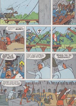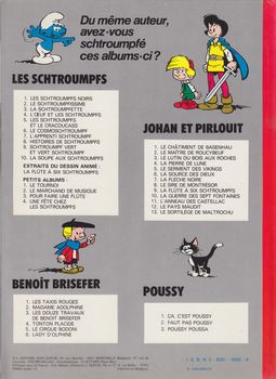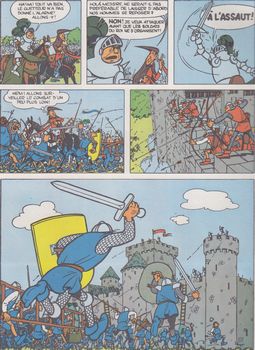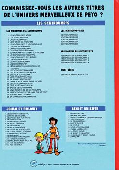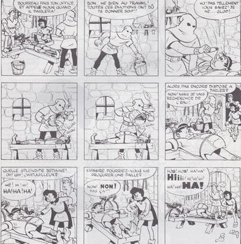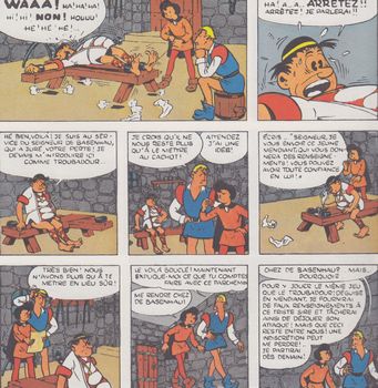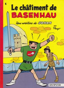 remarques: | réédition dos carré rouge, 45 pages couleur les aventures de Johan qui deviennent "Johan et Pirlouit" à partir du tome 3, aventures médiévales de deux compères qui ont enchanté les lecteurs du journal de Spirou pendant ses grandes années, c'est dans le tome 9 qu'apparaissent pour la première fois les Schtroumpfs (en allemand Johann und Pfiffikus) n.b. il y eut de nombreuses rééditions (14x) de 1954 à 2016, mêmes couvertures sauf le 4ème plat de la réédition 2016 qui est transformé le Sire de Basenhau est chassé du royaume par le roi pour combat déloyal contre le comte de Tréville lors des joutes royales, Basenhau jure de se venger >> p. 13 la torture du faux troubadour (planche originalement censurée et annulée, voir le ventre du torturé) Johan, écuyer de Tréville, part déguisé en mendiant espionner le sire de Basenhau dans son château >> p. 17 les sauts d'humeur de Basenhau >> p. 20 lui et Louis >> p. 35 un prisonnier bien enchaîné Basenhau avec son armée décide de s'emparer du château du roi, mais Johan lui tend un piège en lui conseillant d'attaquer le château du roi faiblement défendu sur les remparts sud; combat des soldats rouges de Basenhau contre les bleus du roi, l'assaut du château échoue, Basenhau est fait prisonnier et ses terres confisquées >> un premier album dont le graphisme est encore peu recherché, mais le scénario est déjà bien maîtrisé et bien élaboré avec une bonne pointe d'humour, de l'action soutenue qui laisse prévoir une bonne continuation annexes - couvertures 1 et et 4ème plat, page de garde et extraits - détails sur la planche censurée originale et celle de l'album (la scène de torture a été supprimée) - 4ème plat de la réédition de 2016 Information Johan et Pirlouit est une série de bande dessinée jeunesse belge créée par Peyo, publiée pour la première fois dans le journal Spirou le 11 septembre 1952, et éditée en album, avec le châtiment de Basenhau, en janvier 1954 par les éditions Dupuis, après la mort de l'auteur, la série est reprise en 1994 par Yvan Delporte et dessinée par Alain Maury Johan, l'intrépide écuyer, et son compagnon d'aventures: le nain Pirlouit (et sa fidèle Biquette), vivent dans un Moyen Âge de fantaisie, où ils font partie de la cour du roi les principaux personnages: - Johan: jeune page aux longs cheveux noirs qui rêve de devenir chevalier, courageux, gentil, sarcastique et intelligent, il vit au château du roi et est habile à l'épée ainsi qu'à l'arc, l'expression qu'il utilise le plus souvent est "bon sang" - Pirlouit: nain blond râleur et glouton, froussard, intuitif, farceur, pénible, crédule, menteur et piètre musicien et chanteur, il vivait de rapines dans le bois aux Roches avant que le roi ne l'emploie comme bouffon, quand il a réussi quelque chose, il crie "piiirlouit", il apparaît dans la série à partir de l'album no 3, Le lutin du bois aux roches, il devient alors le fidèle compagnon de Johan qu'il accompagne dans ses aventures - Biquette: la chèvre noire de Pirlouit, incapable de résister à un chou, mais ayant un fort caractère, ses coups de cornes sont redoutables, elle apparaît dans la série à partir de l'album no 3 - le roi: débonnaire mais ferme, grand amateur de vin, le roi est aimé de ses sujets et de ses vassaux, il est cependant assez caractériel et semble parfois gâteux, il a une nièce ravissante mais pas d'héritiers directs, on ne connaît pas son nom, il apparaît dès l'album no 1 - Homnibus: enchanteur, astronome et magicien, il a le don de lire dans une boule de cristal, il est également alchimiste et herboriste, il porte une grande barbe blanche, une robe bleue et, sur la tête, un calot bleu, il est secondé par son apprenti, Olivier, un jeune garçon roux, tous deux vivent dans une chaumière, grand ami de Johan et Pirlouit, il leur vient en aide lors des situations qui requièrent quelque auxiliaire magique, il apparaît également dans la série les Schtroumpfs et aide ces derniers à plusieurs reprises - Rachel: vieille sorcière, à la réputation sulfureuse, elle a un bon fond et connaît la composition de divers philtres dont celui qui fait mourir de rire - le comte de Tréville: fringant chevalier, il est un modèle pour Johan, il est plus grand que lui, il a été mentionné par Johan au début de l'album le maître de Roucybeuf où il vivait dans son château - dame Barbe: vieille femme toujours habillée d'une robe verte, c'est la langue de vipère du château, elle est surnommée "dame Barbara" dans la série animée - les Schtroumpfs: ce sont des petits lutins bleus, ils font des apparitions, la plupart du temps par le biais d'Homnibus, ils apparaissent pour la première fois dans la flûte à six schtroumpfs, et dans l'album la guerre des sept fontaines, le Grand Schtroumpf va joindre Johan et Pirlouit chez Rachel le 11 avril 1946, Peyo, un ancien gouacheur de dessin animé, mis au chômage après la faillite de la Compagnie belge d'actualités, lance dans le quotidien bruxellois "la Dernière Heure", un personnage nommé Johan, Peyo se recycle dans la bande dessinée, un marché porteur après la seconde Guerre mondiale, cette dernière ayant interrompu l'importation de séries américaines en Europe, les éditeurs belges sont obligés de se tourner vers des auteurs belges pour remplacer les séries absentes, après quelques séries éphémères (Pied-Tendre dans Riquet et une enquête de l'inspecteur Pik), Peyo parvient à placer Johan dans le grand quotidien après avoir rencontré le responsable des pages Jeunesse par l'intermédiaire d'une fille qui chante dans la même chorale que lui, la première apparition de Johan est modeste, il s'agit d'un gag en quatre cases, sans paroles, qui met en scène un page blond vivant au Moyen Âge, le second gag paraît le 1er août 1946 et s'intitule "les aventures de Johan", le troisième, publié le 12 septembre 1946, fait apparaître 