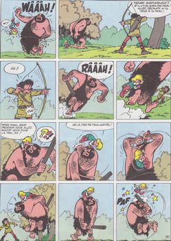 remarques: | réédition 1981 avec dos carré jaune Johan et Pirlouit reviennent du pays des vikings par voie maritime, Pirlouit a le mal de mer par petit roulis mais il se sent bien quand la tempête fait rage, leur navire fait naufrage, ils sont recueillis dans un village paysan qui est sous la coupe des sbires de Gracauchon, les habitants du village sont trop faibles pour se défendre, l'histoire des mollassons devenus faibles suite au sort jeté par une sorcière, ils pourraient être guéris grâce à l'eau de la source des dieux, mais ils sont trop faibles pour voyager, Johan et Pirlouit décident alors d'y aller à leur place >> p. 26/27 rencontre avec le géant sur la route de la source miraculeuse finalement, les deux compères arrivent à la source qui est gardée par un vieil hermite protégé par des serpents, il se laisse toutefois attendrir et leur cède une besace d'eau de la source et après avor échappé aux sbires de Gracauchon, l'eau de la source des dieux parviendra aux mollassons qui deviendront forts et se soulèveront contre Gracauchon et ses sbires >> p. 35 le gardien de la source et ses serpents >> un album avec un scénario assez original sans être vraiment très élaboré et un graphisme qui devient une ligne de plus en plus claire |