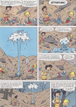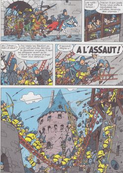 remarques: | réédition 1982 avec dos carré bleu, toujours de 62 pages Johan et Pirlouit arrivent à un mystérieux château désert et hanté >> p. 12 l'histoire du fantôme de sire Aldebert de Baufort, l'eau transformé en vin par un souhait non réfléchi de sire Aldebert, apportera la malédiction de la vieille sorcière Sara qui arrêta le vin de couler, mais ne fit plus non plus revenir l'eau Johan part à la recherche de Rachel, la sorcière, à qui Sara aurait transmis ses pouvoirs, mais Rachel ne peut rien faire, toutefois réapparition des Schtroumpfs en visite chez Rachel qui promettent à Johan de faire rejaillir l'eau des sept fontaines en fabriquant une baguette magique de coudrier >> p. 23 les effets du vin merveilleux sur Pirlouit le récit continue avec la recherche du vrai héritier du fantôme Baufort qui, après de durs combats, pourra enfin prendre possession de son château et par la même occasion permettra au fantôme Aldebert de pouvoir regagner les cieux et être accepté par ses aîeux >> p. 57 un mémorable assaut de château >> un album avec sur le fond une idée originale, qui reste malgré tout intéressante et Biquette n'est plus très présente dans cet album |
