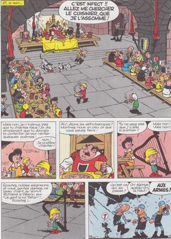 remarques: | réédition 1981 au dos carré gris le naufragé Hubert, duc de Castellac, qui a réussi à s'évader des prisons du seigneur Hercule de Basse-Fosse suite à la trahison de Acelin, écuyer de Castellac, qui veut devenir duc à la place du duc, raconte son histoire à Johan qui veut bien lui venir en aide mais Hubert est capturé et drogué par Acelin qui l'utilise comme homme de paille avant de vouloir le supprimer, Pirlouit est alors engagé comme maître-chanteur et musicien à la cour de Hercule de Basse-Fosse pour trouver une preuve de la félonie d'Acelin et nos amis réussiront à délivrer le vrai duc de l'emprise du félon Acelin >> p. 37 à 39 le plat culinaire "britchchabrotch" concocté par Pirlouit >> un nouvel album de 62 pages mais qui n'apporte rien de très intéressant mais toujours amusant |