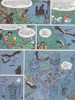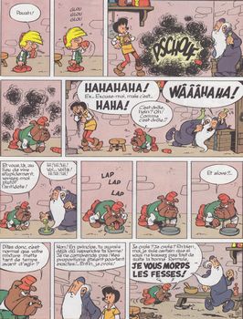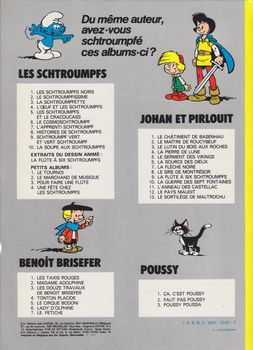 remarques: | réédition 1981, avec dos carré jaune, 62 pages dernier album scénarisé et dessiné par Peyo l'expérience malheureuse de Pirlouit: >> p. 7 changer de l'or en plomb et qui rencontre le chien qui parle qui n'est autre que le bon chevalier Thierry de Plennevaux qui a été changé en chien par le triste sire de Maltrochu parce que la belle Geneviève aimait Thierry et non Maltrochu >> p. 14 les jeux de mot sur le chien Johan et Perlouit décident de s'emparer de la formule de transformation chez le sire Maltrochu pour la soumettre à l'enchanteur Homnibus afin que celui-ci puisse préparer un antidote Pirlouit devient alors le cobaye pour essayer l'antidote >> p. 37 Pirlouit transformé en chien pour essayer l'antidote mais Homnibus ne trouvera le véritable antidote que grâce à l'intervention des schtroumpfs et de leur action-commando >> à nouveau un album de 62 pages avec une idée plutôt originale et un scénario un peu mieux exploité pour de dernier album imaginé par Peyo, les schtroumpfs inventés en 1959 suite à l'épisode de Johan et la flûte à six trous en 1958 (1960 en album) prennent de plus en plus d'importance dans les aventures de Johan |