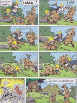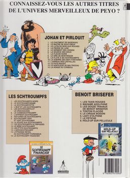 remarques: | graphisme: A. Maury, scénario: Delaporte et Thierry Culliford, fils de Peyo = Pierre Culliford premier volume repris par Culliford et Maury à la mort de Peyo, l'éditeur devient Lombard, dos carré jaune, nouvelle page de garde et nouveau 4ème plat, retour aussi aux 48 pages des premiers albums Pirlouit détraque le temps avec un vieux trombone à piston (une sacquebute), tandis que les huns (la horde du corbeau) ravagent le royaume de Mazovie/Podlachie, parent du roi de Johan et celui-ci avec Johan part à leur aide en levant une armée Pirlouit dont on n'accepte pas les dons musicaux quitte le château pour se réfugier chez son ami, le baron-troubadour Joël de Fafluth qui sera trahi par Humbert, son serviteur-félon, à la tête d'un groupe de brigands toutefois, grâce à l'aide de l'enchanteur Homnibus et à nouveau des schtroumpfs, tout rentrera en ordre après quelques mésaventures sans grand intérêt >> bien que ressemblant à celui de Peyo, le dessin de Maury n'est plus aussi bien conçu que celui de Peyo et le scénario, beaucoup influençé par la légende de Robin des Bois, n'est pas à la hauteur des albums précédents, étant quelque peu fade, comique et sans éclat malgré les quelques jeux de mots, notamment sur les khan (Fraindj-Khan-Khan) >> 24 ans après la parution de l'album 13 (sortilège de Maltrochu), ce n'est vraiment pas une réussite, mais il fallait s'y attendre à noter: on revient à des albums de 48 pages n.b. il y aura encore trois albums parus mais non collectionnés ici: 15/ - les troubadours de Roc-à-Pic (1995) 16/ - la nuit des sorciers (1998) 17/ - la rose des sables (2001) |