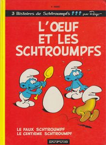 remarques: | réédition dos carré jaune album divisé en trois épisodes 1/ l'oeuf et les schtroumpfs les schtroumpfs à la recherche d'oeufs pour faire un gâteau lors d'une fête, mais l'oeuf qu'ils ramènent est un oeuf magique qui exauce les voeux qu'on lui demande >> p. 14 le petit schtroumpf qui veut devenir un géant finalement, l'oeuf deviendra poussin, puis un magnifique coq 2/ le faux schtroumpf Gargamel pour se venger se transforme en schtroumpf, mais il ne sait pas parler le langage schtroumpf et il n'aime pas les salsepareilles, donc il sera vite démasqué >> p. 29 la danse schtroumpfante des schtroumpfs 3/ le centième schtroumpf la danse lunaire qui doit être effectuée avec 100 schtroumpfs, or ils ne sont que 99, le 100ème sera trouvé grâce à un dédoublement de personne avec un miroir magique >> p. 49 variations sur un miroir >> p. 52 la danse lunaire avec 99 participants + le grand schtroumpf >> à nouveau une BD enfantine parfaite avec un bon graphisme, mais rien de particulier ni d'oeuférisant |