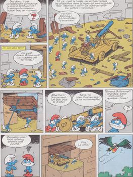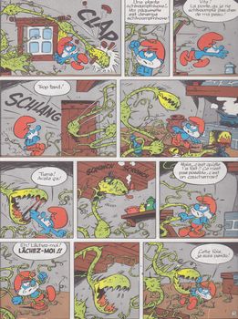 remarques: | réédition dos carré rouge album en deux épisodes: 1/ les schtroumpfs et le cracoucass en faisant des expériences, le grand schtroumpf produit une belle fleur qui devient peu après une plante schtroumpfnivore, après l'avoir détruite avec peine, ses restes sont jetés dans un précipice, mais une goutte de sa sève tombe dans un nid d'oiseaux et l'un des oiseaux en l'absorbant devient le monstre cracoucass qui sème la terreur dans le village schtroumpf >> p. 22 schtroumpfe qui peut et pour se défendre, les schtroumpfs fabriquent >> p. 30 une baliste géante qui lance des pétards et après avoir endormi le cracoucass en lui faisant avaler un soporifique, les schtroumpfs lui redonnent sa taille de petit oiseau grâce à un elixir magique 2/ un schtroumpf pas comme les autres un schtroumpf qui s'ennuie part pour un voyage autour du monde, mais peu après son départ, il est capturé par Gargamel; le grand schtroumpf réussira toutefois à administrer à Gargamel une piqûre d'amour qui rend Gargamel, pour un temps seulement, gentil et aimable et finalement le schtroumpf vagabond se rend compte qu'on est bien mieux chez soi (home sweet home) qu'en vagabondant à travers le monde >> des aventures toujours enfantines, amusantes mais sans prétention, malgré un bon graphisme quelque peu différent entre le premier et le deuxième épisode |