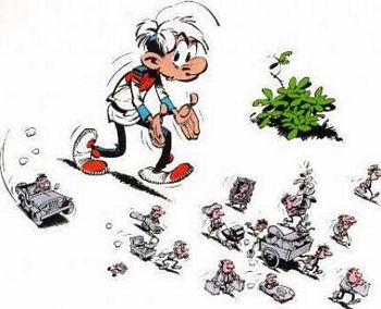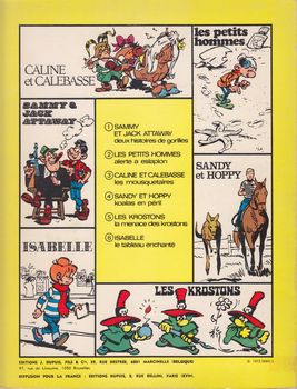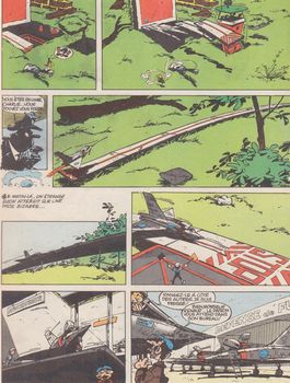 remarques: | édition broché, collection Okay no 2, seul exemplaire des petits hommes dans la collection Okay deux épisodes: a) les origines du monde des petits hommes causé par la grande contagion qui fit rétrécir les habitants de Rajevols, la lutte des petits hommes pour protéger leur cité construite dans une immense citerne désaffectée et ce sera l'expédition "sabotage" depuis la base d'Espalion-sous-Rajevols >> p. 4 la piste d'atterrissage de la base souterraine b) l'opération dépannage pour un coléoptère des petits hommes échoué sur le coq du clocher de l'église du village, opération menée par monsieur Renaud, le personnage principal chez les petits hommes >> un premier album avec un bon graphisme et surtout un beau coloriage, récits inspirés de Franquin, le fond de l'histoire est assez original, mais le texte est bien miniaturisé aussi annexes - couvertures et extraits du premier album - couvertures de l'avant-dernier et du dernier album (la série des petits hommes comporte 44 albums de 1963 à 2010 aux éditions Dupuis, mais seuls les 6 premiers albums sont collectionnés ici) n.b. Pierre Séron né en 1942, décédé en 2017 bibliographie: les centaures - la famille Martin - les fondus - les petits hommes - les petites femmes (série érotique) - le Scarmeustache Information les petits hommes est une série de bande dessinée humoristique franco-belge réalisée par Pierre Seron au dessin-scénario, Albert Desprechins et Mittéï au scénario, éditée par les éditions Dupuis, elle est apparue pour la première fois dans le journal Spirou no 1534 du 7 septembre 1967 avec alerte à Eslapion-sous-Rajevols, titre qui sera transformé en alerte à Eslapion pour la première parution en album (1972) dans la collection Okay, la série sera publiée dans Spirou jusqu'en 2007, les trois derniers albums ne seront pas publiés dans le magazine avant leur sortie en album, l'ultime tome de la série, Eslapion 3 (2010), sera lui publié par l'éditeur Clair de Lune à la suite d'un refus des éditions Dupuis de l'éditer c'est dans le petit village de Rajevols que commence l'aventure des petits hommes, un chercheur trouve un fragment de météorite dans son jardin, ce qu'il ne sait pas encore, c'est que sa découverte va bouleverser la vie de tous les habitants du village, ce morceau de météorite, lorsqu'il est touché, a pour effet de réduire la taille de celui qui le touche, mais cela ne s'arrête pas là, puisqu'un simple contact physique avec une personne contaminée entraîne les mêmes effets ainsi, le lendemain, ce sont tous les êtres humains du village qui ont rapetissé, les petits hommes n'ont alors plus d'autre choix que de créer une nouvelle ville à leur taille: ce sera Espalion-sous-Ravejols grâce au docteur Joachim Hondegger, les petits hommes bénéficient rapidement d'une technologie très avancée qui leur permettra de venir à bout de toutes les difficultés auxquelles ils seront confrontés, mais au prix de maintes péripéties née au début des années 1970, la série n'est qu'une série de plus dans le paysage fourni de la bande dessinée de jeunesse franco-belge de l'époque: personnages à gros nez dans le style de Franquin, histoires humoristiques et gentillettes, une série sympathique, mais qui ne sort pas spécialement du lot, entre alerte à Eslapion et l'exode, le dessin de Seron s'est éloigné du style Attanasio pour se rapprocher de celui du Franquin des Gaston, auquel il emprunte les proportions de ses personnages et la plupart de ses effets de modelé (visages et vêtements) dans les années 1980, Pierre Seron prend la direction artistique complète de sa série et en devient le scénariste exclusif, le dessin se modernise et les personnages trouvent leur aspect quasiment définitif vers cette époque; côté scénarios, la technologie et l'aéronautique sont toujours présents dans ses albums, comme les coléoptères par exemple, la série s'oriente vers la science-fiction ce qui permet à l'auteur d'imaginer des engins et des architectures plus futuristes, cette tendance se poursuit d'album en album, puis à partir de voyage entre deux mondes une nouvelle tendance s'esquisse, à l'exception d'albums science-fiction et du cycle des clones, la série s'attache alors davantage à raconter des aventures humaines dont l'action se déroule dans les grottes des petits hommes ou à leurs abords et mettent en scène l'histoire personnelle de personnages secondaires: - des canards boiteux de la petite communauté (voyage entre deux mondes), - deux guerriers du passé se refusant à enterrer la hache de guerre (Choucroute Melba), - un bébé adopté qui se retrouve de nouveau orphelin (bébé Tango), - deux enfants imprudents et irresponsables (Bingo), - une fillette qui se réveille d'un long coma (miss Persil), - un perdant qui devient roi (les fourmicrabes), - la jeune victime d'un coup monté crapuleux et sordide (Chiche), - deux frères ambitieux et sans scrupules (au nom du frère) bien que Belge de naissance, l'auteur Pierre Seron semble porter une certaine affection aux noms pittoresques de certaines localités françaises dont il s'inspire largement pour nommer les lieux fictifs où vivent les petits hommes, en les détournant: Eslapion d'Espalion, Ravejols de Marvejols ou encore Berg-en-Brousse de Bourg-en-Bresse |