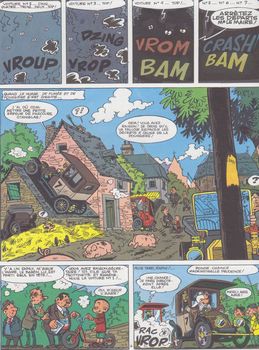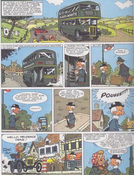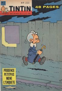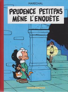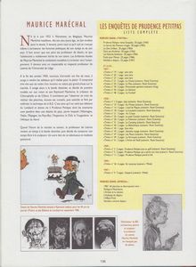 remarques: | album intégral des aventures de Prudence Petitpas, les aventures d'une intrépide vieille dame qui résout des énigmes policières à l'instar de l'héroïne d'Agatha Christie = miss Marple, forte ressemblance aussi avec la série du colonel Clifton et miss Partridge (Maréchal beaucoup influencé par Macherot) et peut'être aussi avec Madame Adolphine (Benoit Brisefer) 4 épisodes dans cet intégral: 1/ Prudence Petitpas mène l'enquête à Moucheron où la vie se déroule paisiblement, des actes criminels s'enchaînent dans le village, la librairie Flocon est particulièrement visée; l'inspecteur Duroc assisté par le garde-champêtre Cyprien et par la vieille dame Prudence Petitpas avec son chat Stanislas enquêtent à petit pas le pot aux roses est découvert: Bill Rusline qui a volé des diamants, se réfugie à Moucheron chez un proche parent, le libraire Flocon et comme Bill Rusline est le frère jumeau du libraire, Bill a enlevé celui-ci et a pris sa place, mais c'était sans compter avec la perspicacité de Prudence Petitpas >> p. 32/33 les exposés détaillés de l'enquête Prudence Petitpas 2/ Prudence Petitpas et le secret des poissons rouges le locataire de Prudence Petitpas qui accorde beaucoup d'importance à son bocal de poissons rouges, mais finalement Prudence découvrira qu'il s'agit d'un règlement de comptes entre les gangsters Fredo la Purée et Narcisse Fraiminois, le plan indiquant où se trouve le butin des gangsters étant dissimulé dans le bocal des poissons rouges >> p. 55 le kidnapping de Prudence Petitpas >> p. 64 ce n'est plus de mon âge ces acrobaties, si monsieur le curé me voyait 3/ Prudence Petitpas et le zero brillant Prudence Petitpas en visite chez sa copine Winnifred Dubbledry à Goshawful en Angleterre, dans une pharmacie locale, Prudence Petitpas reçoit par inadvertance une fiole de zero brillant (= mixture qui abolit la pesanteur) au lieu d'une petite bouteille de cognac pour concocter un des ses plats typiquement moucheronnais, Scotland Yard et la bande d'espions de Max Bivfstexk sont à la recherche du zero brillant, mais finalement force restera à la loi >> p. 71 le compagnon de Stanislas: le chien John Bull 4/ gare aux ancêtres une arme redoutable ultra-secrète a été dérobée et dissimulée sous la voiture de Prudence Petitpas qui prend part à un rallye d'ancêtres-automobiles de Moucheron aux Pyrénées, tout le rallye sera disturbé à cause de cette arme (un pistolet laser) que Scotland Yard et une bande d'espions recherchent assidûment >> p. 103 l'ancêtre-automobile de Prudence Petitpas et avant de retrouver la fameuse arme, il faudra subir les nombreux avatars du rallye 5/ le dossier Prudence Petitpas >> p. 136 liste complète des aventures de Prudence Petitpas parues dans les journeaux Tintin et Spirou de 1960 à 1983, parues partiellement en albums publiés par Lombard Jeunesse (broché): - mène l'enquête B JE no 16 (1962) - et le zero brillant B JE no 44 (1966) - gare aux ancêtres B JE no 49 (1967) - fusils pour Macao B JE no 56 (1968) (non compris dans l'intégral) + Prudence Petitpas et le secret des poissons rouges (1987, cartonné) + les deux intégrals (1995 et 2008) n.b. de nombreux épisodes (16) avec Goscinny comme scénariste (courts épisodes, 1 à 3 pages dans Tintin 1958-1959 et non parus en albums) les épisodes présentés dans l'intégral sont des récits de 30 pages créés par Maréchal et parus dans le Journal Tintin de 1960 à 1967 >> le texte n'est pas très élaboré et plutôt naïf, mais pas dénué de logique, idem pour le graphisme et seul le premier épisode dans l'intégral est vraiment digne d'intérêt, mais curieusement ces aventures ont eu quelque succès auprès des lecteurs de Tintin puis continués dans Spirou en 1983, il y aura même en plus une série de 12 téléfilms d'animation annexes - couvertures 1er et 4ème plat et extraits de l'album - p. 136 biographie de Maréchal et liste des récits Prudence Petitpas - couverture du journal Tintin - couverture de l'épisode fusils pour Macao non intégré dans l'intégral Information Prudence Petitpas est une série de bande dessinée franco-belge créée par Maurice Maréchal et parue la première fois en 1957 dans le Journal de Tintin, ont contribué par la suite aux scénarios: René Goscinny, Greg, Mittéï, Didjé et Jiem, la série est parue dans le magazine Journal de Tintin de 1957 à 1967 et dans le Journal de Spirou de 1984 à 1987 c’est en 1957, que Maréchal, sur les conseils de son voisin et ami Raymond Macherot, se présente au bureau des éditions du Lombard avec son projet sous le bras, une vieille dame baptisée Prudence Petitpas confrontée à des énigmes policières, ce n’est pas par hasard qu’il propose un personnage âgé, en effet, il a remarqué que tous les personnages à succès du Journal de Tintin sont des jeunes, voire des enfants, prendre le contre-pied absolu, voilà qui est nouveau et lui donne une chance d’être remarqué, Prudence Petitpas fera ses premières apparitions dans des gags de deux ou trois pages, c'est seulement après quelques années qu'elle deviendra l'héroïne d'histoires "à suivre", desquelles on tirera des albums, cheminement semblable à celui de Strapontin ou du Signor Spaghetti, autres héros du Journal de Tintin apparus à la même époque Prudence Petitpas habite le petit bourg de Moucheron, un village imaginaire inspiré d’un décor authentique: Sauveterre-de-Rouergue, situé entre Albi et Rodez où Maréchal passe chaque été un mois de vacances, l'héroïne y passe le plus clair de son temps à débrouiller toutes sortes d’énigmes policières |
