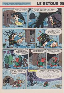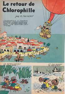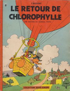 remarques: | album Lombard 1961 EO Jeune Europe no 8 32 pages Chlorophylle et Minimum quittent par ballon aérostat Coquefredouille pour retourner à leur pays natal: Saint-Agenor-sur-Siphon retrouvailles avec Torpille la loutre, Serpolet le lapin et un nouveau venu Caquet l'étourneau la nouvelle activité de Chlorophylle: confectionner des vêtement pour ses amis les animaux (surtout pour les souris) et fabriquer des poêles pour les froides journées d'hiver toutefois, un beau jour, Chlorophylle disparait >> p. 20-22 les péripéties de Mifasol le pinson à la recherche de Chlorophylle et qui doit se déguiser en canari jaune pour échapper aux oiseaux de proie Mirontin, le muscardin, part aussi à la recherche de Chlorophylle et finalement celui-ci est retrouvé et délivré, il avait été enlevé par les frères rats Guipure et et Fanfreluche qui obligeaient Chlorophylle à travailler pour eux comme tailleur >> une courte histoire amusante, mais sans grande prétention avec toutefois un superbe graphisme et coloriage |