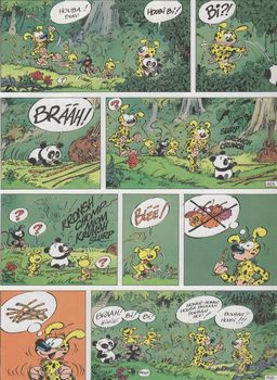 remarques: | la capitale de la Palombie: Grande Ciudad l'histoire: deux chinois en route vers la Chine avec un panda tombe en panne en Palombie à cause d'une grève-surprise et suite à un accident d'avion, le panda est abandonné dans la jungle palombienne où habite le marsupilami qui prend en charge le panda le marsupilami devient presque une mère pour le panda à qui il doit fournir du bambou comme seule nourriture, finalement tout reviendra en ordre, les deux chinois réussissant à récupérer leur panda >> p. 9 voyage-surprise avec l'aviateur Helmut Ersatzausweiss von Lilimarlehn >> p. 30 apparition de l'oiseau Tignass >> un album au scénario plutôt faible, mais avec un bon graphisme |