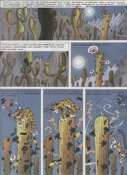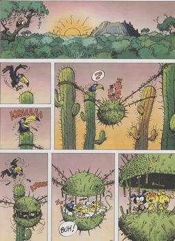 remarques: | le cratère du monte Urticando dans la jungle palombienne avec ses cactus "comitl" et leur pollen contagieux les trois petits marsupilamis sont laissés seuls dans le cratère à l'environnement dangereux, ceci pour qu'ils apprennent le dur apprentissage de la survie >> p. 9 les trois p'tits marsus ils doivent affronter le vieux jaguar Gatogordo, le serpent l'imalipusram, la mante religieuse noire Pador kidepourmis, le fourmilier tamarsupilanoir, le tatou glyphordon et le pollen des fleurs de cactus du monte Urticando, mais les p'tits marsus se débrouilleront très bien >> p 23 la tactique de défense du imalipusram >> p. 41 le nid-forteresse des p'tits marsus >> des gags à gogo, quelques bons jeux de mots, un bon graphisme respectable avec un très bon coloriage mais il manque toujours un certain "touch" ou "enchantement" marsupilamiste à ces albums |