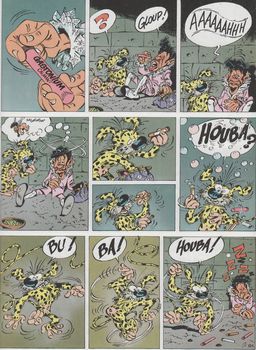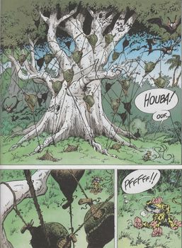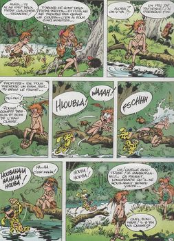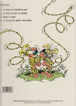 remarques: | au zoo de Chiquito à Grande Ciudad, capitale de la Palombie, un vieux marsupilami se laisse mourir d'ennui, mais un perroquet-ara réussit à s'échapper pour avertir Bip, Sarah et le marsupilami sauvage >> p. 5 l'emblème de la Palombie: le marsupilami ceux-ci décident de délivrer le vieux marsupilami et se rendent à Chiquito où se déroulent les fêtes d'anniversaire de Baby Prinz, le dictatillon, fils du dictateur Papa Prinz, la tradition veut qu'il y ait toujours un attentat lors de ces anniversaires >> p. 13 le nid de Baby Prinz >> p. 13 à 23 la revolucion bat son plein, Bip et Sarah sont arrêtés comme complices de la Seguridad Nacional dont les agents ont pris l'habitude de se déguiser en marsupilamis >> p. 21 même des belges participent à la revolucion >> p. 22 un marsupilami à moustaches >> p. 33 les zouaves pontificaux finalement, après avoir délivré le vieux marsupilami, celui-ci se rend au cimetière des marsupilamis pour y mourir, mais après réflexion, il refusera de mourir, la vie étant encore belle >> p. 40 le cimetière des marsupilamis >> un album très loufoque, peu de bons gags et au scénario sans grand intérêt, mais dont le graphisme reste acceptable n.b. il y aura de 1991 à 2025 encore 30 titres d'album sur cette série, le dernier étant "Marsu-club" en 2025 mais il ne sont plus collectionnés ici annexes - couverture et 4ème plat - extraits de l'album no 5 - couverture du tome 0 (2002) reprenant quelque peu l'album hors-série "Gaston et le marsupilami" - le marsupilami au cinéma |