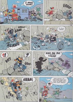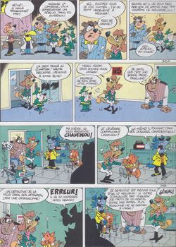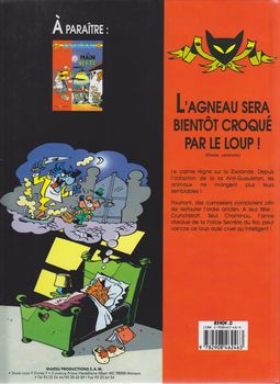remarques: | deuxième tome d'une nouvelle série commencée en 1989, cet album-ci avec Saive en collaboration avec Macherot pour le scénario album de 46 pages (contrairement à l'album Chaminou et le Khrompire de 62 pages) une fuite de Crunchblott est organisée par de nouveaux complices dont la comtesse de Saint-Goupil (une renarde) aidée par le prof. Urubu >> p. 5 une Zonzon avec des bigoudis qui a inventé un nouveau parfum nommé loup-garou qui fait fuir les carnivores et Crunchblott retrouve aussi son serviteur Placide, le gorille accompagné maintenant de son cousin Hercule pour une nouvelle mission: semer la panique en Zoolande >> p. 34 Zonzon = la nouvelle star de cinéma >> p. 41 W.C. = Warner C. Toubon, directeur de Media Pub >> p. 44 le parfum de Crunchblott: le pruneau 45 de Saint-Pétard la comtesse de Saint-Goupil sera finalement démasquée et arrêtée, mais Crunchblott et ses acolytes réussiront à prendre le large >> un épisode qui ne fait guère honneur à Macherot, graphisme négligé, texte peu recherché et sans saveur, bref si la signature de Macherot est présente sur la couverture d'album, lui-même n'est d'ailleurs plus beaucoup présent dans le récit n.b. toutefois 4 nouveaux albums seront édités de 1989 (24 ans plus tard) à 1995 par Marsu Productions, soit 2/ l'affaire Carotassis (1989) 3/ la peur du loup (1992) 4/ la main verte (1993) 5/ l'opuscule sans scrupule (1995) non collectionnés ici sauf la peur du loup >> voir détails dans Chaminou et le Khrompire |