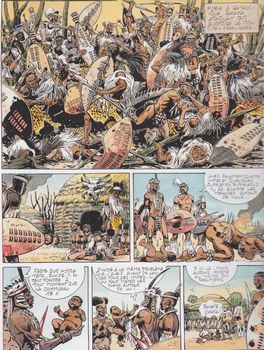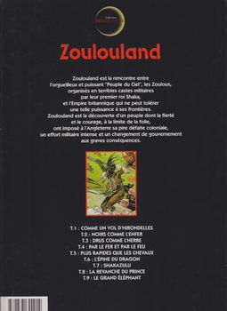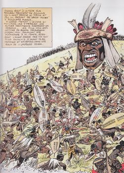remarques: | Shaka est maintenant devenu un seigneur de la guerre, à la mort de Dingiswayo il devient chef des Mthetwa et à la mort du chef des zoulous, Shaka prendra aussi le commandement de la tribu des zoulous il sera alors à la tête d'une formidable armée et supprimera son dernier adversaire: le chef Zwide de la tribu des Swazis Shaka devient alors chef absolu et illimité du Zoulouland mais il finira sa vie comme un despote cruel et sera finalement assassiné par ses demi-frères, las de son tyrannisme Shaka 1787-1828 restera toutefois célèbre comme génie politique et militaire >> fin du deuxième cycle, la série ne sera pas continuée car celle-ci se perd dans des aventures moins intéressantes, toutefois une belle couverture pour ce tome no 9 de 1996 à 2003, il y aura encore 9 volumes mais non collectionnés ici, soit: - young mister Dundee (1996) - les fils de M'Pande (1997) - les yeux de gazelle (1997) - les forces de l'empire (1998) - Loulou (1999) - Ulundi (2000) - Cetewayo (2002) - les Boers (2003) - dernières révoltes (2003) |