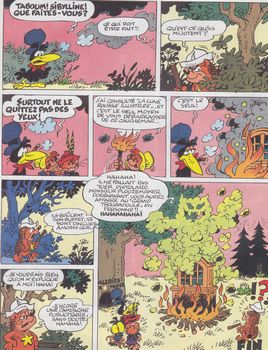 remarques: | album en trois épisodes 1/ - Burokratz le vampire apparition de Burokratz le vampire tartophage (qui vole les tartes pour les manger) et c'est le pauvre Anathème qui en est d'abord accusé, Burokratz sera finalement arrêté grâce à un somnifère que Sibylline et ses amis ont mis dans une tarte >> p. 8/9 Verboten qui se conduit mal avec Anathème 2/ - la puce fatale retrouvailles avec le petit cirque et l'histoire de la puce vagabonde qui s'installe sur Sibylline, pour s'en débarrasser, Sibylline plonge dans de l'eau très froide et découvre que la puce est en fait Pistolard transformé en puce qui sera méchamment écrasée par Flouzemaker (fin de Pistolard?) >> p. 33 unique fois où l'on voit une Sibylline toute nue et qui s'enrhume 3/ - le buffet hanté où il s'avère que ce buffet est habité par le mauvais esprit, le grand Troubadoule qui veut venger la mort de Pistolard >> les récits se suivent mais ne s'améliorent pas, un récit plutôt poussif toutefois, les côtes BDM pour ces albums restent élevées (petit tirage?) |
