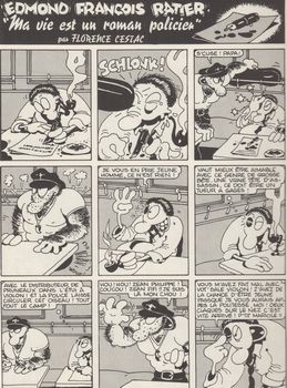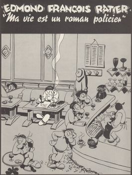 remarques: | album Futuropolis, mars 1986 présentation de Edmond-François Ratier, écrivain et spécialiste du roman polar noir >> p. 4 un parfait exemple de l'argot policier parisien à la Cestac >> p. 29 une affaire de culs >> série de gags avec E.-F. Ratier, un album respectable avec un bon graphisme de Cestac n.b. deux planches sont tirées de l'album "Harry Mickson nettoie ses pinceaux" (1982) annexes - couvertures Ier et 4ème plat - page de garde - extrait de page - une affaire de cul Information - il s'appelle Ratier, Edmond-François Ratier, c’est un noble? que nenni! et ce n'est même pas un héros, c'est un écrivain un écrivain connu? ben, disons qu'il est auteur de romans policiers, mais il ne travaille pas chez lui, Edmond-François, il préfère, et de loin, s'installer à une table de bistrot, et là, parmi la faune qui compose parfois la clientèle, Edmond-François peut laisser libre cours à son imagination - toutefois, forcément, c'est pas en écrivant à une table de bistrot que l'on peut penser et rédiger dans la tranquillité car des gugusses de tous bords, il en passe dans un bistrot, et s'il ont envie de s'adresser à quelqu'un, c'est bien sûr à Edmond-François qu'ils vont s'en prendre, tant verbalement que physiquement, mis, l’air de rien, ne sont-ce pas ces personnages qui peuvent donner des idées à Edmond-François? |