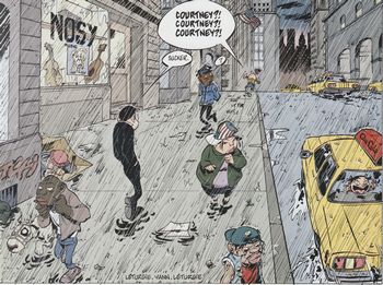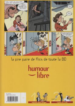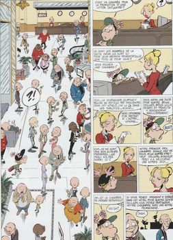 remarques: | une série humoristique avec trois figures principales: miss Courtney Balconi, la célèbre journaliste de BNN protégée par les deux flics: Spoon et White = simplet et blanche-neige qui sont tous les deux amoureux de la jolie Courtney après avoir abattu un photographe par jalousie, Spoon part en vacances à Miami dans l'hôtel Goldgotha où il espère y retrouver Courtney Balconi en fait, il y trouve White également à la recherche de Courtney ainsi que les membres de la secte Azum (la secte des chauves) qui y tiennent leur réunion annuelle >> p. 10 le fétiche en peluche de Spoon = un affreux Dingo appelé Goofy coup de théâtre: une prise d'otages s'effectue à l'hôtel par un groupe de terroristes qui luttent pour la fermeture des parcs d'attraction, commence alors un suicide collectif des membres de la secte en se jetant par les fenêtres et le chef de la police qui assiège le bâtiment avec ses hommes, croit à une exécution des otages >> p. 25 la défénestration des chauves >> p. 27 monter pour se faire descendre >> p. 30 l'intervention des NLW (non lethal weapons) >> p. 31 Spoon = sorte de hideux gnome transgénique >> p. 33 un suicide collectif était de toute façon prévu par le chef de la secte en mangeant le fugu = poisson japonais venimeux White se colle auprès de Courtney Balconi pour la protéger, mais ce sera finalement Spoon qui réussira à s'accaparer Courtney >> p. 46 le mot de la fin: sucker n.b. sucker = person easily tricked (one who readily believes promises or something else), la traduction en français est difficilement traduisible, on peut comparer un sucker à un nigaud, un gogo ou une bonne poire >> la pire paire de flics de la BD, un thriller humoristique parodiant des films connus, de l'humour noir basé sur l'actualité et le cinéma avec un regard satirique sur la société le scénario n'est pas très recherché, mais le graphisme reste bon et surtout le texte de Yann est délectable, allusion et référence au film "piège de cristal" avec parodie de Bruce Willis et Clint Eastwood (qui n'a rien a faire d'ailleurs avec ce film, mais dont le revolver de Spoon est le fameux Magnum 44 de l'inspecteur Harry) n.b. le dessinateur Simon Léturgie, né en 1974, est le fils du scénariste Jean Léturgie qui partage le scénario de la série avec Yann bibliographie de Simon Léturgie: - les 3 petits cochons - Bob Marley - Commedia - Gastoon - John Eigrutel - Polstar - Space cake - Spoon and White - Tekila - Vioq micmac Information - deux flics totalement abrutis, Mickey Spoon et Donald White (Spoon c'est le nain et White c'est le grand), ils n'ont qu'une seule chose en commun: être amoureux de la plantureuse présentatrice de télé Courtney Balconi, ils sont aussi les deux seuls blancs du commissariat new-yorkais - l'une des particularités de cette série est d'être truffée de clins d'œil envers certaines œuvres du cinéma, de la BD ou encore de la musique, cette série caricature aussi de nombreux aspects de l'American way of life, tel que la consommation à outrance, le multiculturalisme, l'influence des films hollywoodiens, les médias de masse et les économies souterraines les personnages: - Mickey Spoon, il est grand fan de Clint Eastwood et des dessins animés Disney, il ne se sépare jamais de sa mascotte: une peluche de Dingo, il vit dans une caravane, nabot nerveux, il tire sur tout ce qui bouge en citant des dialogues de Clint Eastwood remaniés à sa sauce, amoureux de Courtney Balconi, il n'imagine pas un instant que ça n'est pas réciproque et se tient prêt à éliminer tout rival - Donald White, grand dadais dégingandé qui se trouve intelligent et beau, il se croit descendant des passagers du Mayflower, lui aussi amoureux de Courtney Balconi, il ne dédaigne pas à l'occasion de s'intéresser à d'autres jolies créatures - Courtney Balconi, reporter vedette à la chaîne d'information BNN, prête à tout pour réaliser un scoop, y compris se servir de ses charmes; au besoin, elle utilise froidement ses deux amoureux transis - le commissaire, un black obèse et perpétuellement affamé, il se charge d'engueuler ses deux flics, surtout préoccupé par le coût des dégâts provoqués par chaque enquête des deux héros - Enola Gay, médecin légiste d'origine asiatique, elle excelle dans son métier qu'elle exerce avec une passion teintée de cynisme, totalement détachée du sort de ses patients, elle ne semble avoir aucune appréhension face aux cadavres, fussent-ils décédés de la manière la plus sordide qui soit, elle vient souvent en aide à Spoon, White et Courtney - Bruce Ali, dealer de cocaïne, né chinois, il a été adopté par une famille noire de confession juive, principal indic des deux héros, incroyablement gaffeur, il parvient souvent à se mettre dans des situations périlleuses |