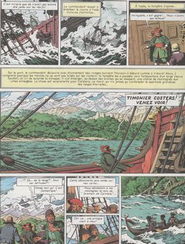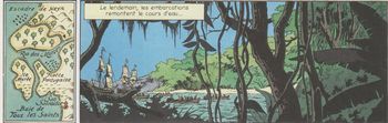 remarques: | réédition des albums brochés 1978 et 1979 "sous les drapeaux de la compagnie" avec un nouveau titre, mais au total un album tronqué de 18 pages (48 pages au lieu de 64 pages) par rapport à l'édition original résumé >> voir l'album EO Bedescope >> p. 34 une information supplémentaire: la carte du raid sur San Salvador (Brésil) >> p. 48 les corsaires de Dunkerque ne sont plus expressément nommés dans cette réédition n.b. aucune date ne sera plus mentionnée dans cet album car la prochaine aventure de Cori se passant avec l'invincible armada en 1588, il en serait résulté un certain anachronisme >> scénario également partiellement remanié et le coloriage est franchement mauvais, mais ceci est dû principalement au graphisme N&B de Bédéscope copié pour cet album, car d'habitude l'impression des albums Casterman est de bonne qualité annexes - couverture Ier et 4ème plat - extrait de page - carte sur l'expédition hollandaise (juillet 1627) à l'embouchure du fleuve rio das mortes près de Sao Salvador (baie de tous les saints) |