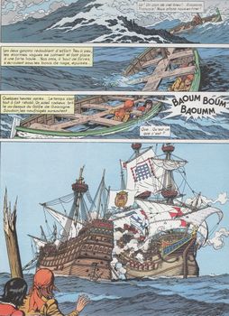 remarques: | les nouvelles aventures de Cori le moussaillon en deux tomes sous le titre principal de l'invincible armada, ces nouvelles anciennes aventures se passent toutefois avant les récits de l'album initial "sous le drapeau de la compagnie" qui se déroulent de 1602 à 1629 alors que l'action de l'invincible armade débute en 1585 n.b. cet album de 48 pages a été édité avant la réédition 1982 du récit cap sur l'or de 1978 d'où les changements qui ont dû être effectués sur l'album édité en 1982 pour la réédition de sous le drapeau de la compagnie (1978) 1588 l'année de la fameuse Armada espagnole (= la Felicissima armada) de 130 vaisseaux avec 30'000 hommes à bord sous la direction de l'amiral Medina Sidonia qui avait peu d'expérience sur les opérations maritimes Cori et son ami Harm sont envoyés à Cadix pour le compte de l'Angleterre afin d'espionner les buts et préparatifs concernant l'armada >> p. 11 l'entrevue avec Elizabeth Ière et avec Francis Drake >> p. 18 Drake aurait pu envahir l'Espagne si l'armada ne prévoyait l'invasion de l'Angleterre >> p. 37 l'entretien avec Philippe II >> p. 43 le combat naval >> un scénario qui en est au début, mais un bon graphisme avec une superbe qualité d'impression par Casterman |