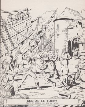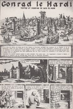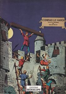 remarques: | album broché, N&B, 36 pages aventures de chevalerie à Anvers au temps de Charles Téméraire, Conrad de Deurne surnommé Conrad le Hardi, le chevalier hercule, prend sous sa protection Renaud, un jeune orphelin qui deviendra son écuyer >> p. 6 la capture originale des 6 brigands par la suite, Conrad le Hardi aura à défendre le château du seigneur de Kessel contre la bande du chef des gueux du bois des sorcières et contre Steenhardt, le chevalier félon; comme récompense, Conrad deviendra le successeur du seigneur de Kessel et mariera sa fille Isabelle >> p. 15 l'épreuve infligée à Conrad par les gueux du bois des sorcières >> récit paru dans le Journal Tintin en 1951, le graphisme est un peu moins bon que dans le récit original, mais tout à fait acceptable avec une jolie couverture d'album et un scénario assez bien imaginé, mais surtout cette fois l'album Bedescope n'est tronqué d'aucune page par rapport au récit paru dans le Journal Tintin (n.b. ce qui n'est souvent pas le cas dans ces rééditions) - réédition en couleur par Bedescope en 1985 annexes - couverture de l'album - illustration pleine page - la Ière planche parue dans le journal Tintin |