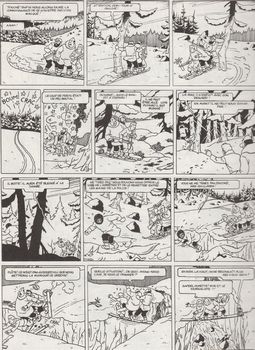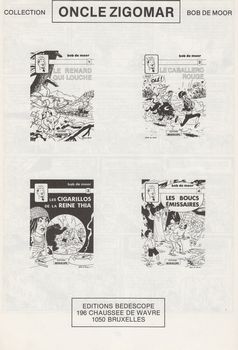 remarques: | album broché Bédéscope N&B de 47 pages affaire d'héritage avec meurtre en Alaska les personnages: - Amédée et Coco Vilain, les frères jumeaux - Boubou et Riri, leurs neveux - le journaliste, Mr. Chipie - Mickey Mus, le contremaître de Amédée Vilain avec son mystérieux renard argenté qui louche - Old Tatterhand le trappeur - la tribu indienne des têtes plates - les scientifiques qui prospectent l'uranium pour le compte du gouvernement récit tiré d'une bande flamande "Nonkel Zigomar" parue en 1951 racontant les aventures hurluburlesques de Coco Vilain alias oncle Zigomar à la recherche de son frère dans les territoires enneigés de l'Alaska >> p. 34 le château moyenâgeux bâti en acier parmi les glaces à noter: par rapport au récit paru dans le Journal Tintin, l'épisode est tronqué de deux planches (pages 6 et 7, en annexe copie des planches tronquées) >> seul album de la série collectionné en tant qu'exemplaire représentatif de la série, et seul récit paru dans le Journal Tintin, les aventures de Monsieur Barelli, de meilleure qualité, prenant la suite des épisodes d'Oncle Zigomar dans le Journal Tintin un graphisme et un scénario sans prétention, mais le meilleur épisode de la série parmi la dizaine de titres édités de 1979 à 2020 par les éditions Bédéscope (N&B) et les éditions Rijperman et BD Must (couleur) les titres parus chez Bedescope: 2/ le caballero rouge (1979) 3/ les cigarillos de la reine Thia (1980) 4/ les boucs émissaires (1979) 5/ l'espion jaune (1980) 6/ l'empire des taupes (1980) 7/ le doigt bleu (2017) 8/ le moteur spa (2017) 9/ le maw maw blanc (2017) 10/ le tapis de sable ensorcelé (2020) 11/ la canne parlante (2020) dès le no 7 parution en couleur chez BD Must annexes - couverture Ier et 4ème plat - les deux planches tronquées parues initialement dans le journal Tintin - page extrait de l'album - couverture du dernier titre paru en 2020 Information oncle Zigomar ou les aventures de l'oncle Zigomar, également connu sous les titres les aventures de Johan et Stephan est une bande dessinée belge créée en 1951 par Bob de Moor l'oncle Zigomar, un bourgeois belge sympathique et gaffeur, vit des aventures extraordinaires en compagnie de ses neveux Johan et Stephan (= prénoms de deux des fils de Bob de Moor) Bob de Moor dessine les aventures d'oncle Zigomar entre 1951 et 1956, la série paraît initialement en anversois sous le titre de avonturen van Nonkel Zigomar, Snoe en Snolleke dans divers quotidiens flamands, jusqu'à son arrivée dans le journal Tintin, six de ces aventures seront publiées par Bédéscope sous le titre les aventures de l'oncle Zigomar, en noir et blanc et en version tronquée entre 1979 et 1980, plus tard, de 1987 à 1994, 5 de ces titres reparaissent en albums cartonnés couleurs sous le titre les aventures de Johan et Stephan, édités par Rijperman auxquels se sont ajoutés 4 autres histoires inédites en français publiées par BD-Must en 2017, une campagne de crowdfunding a été lancée en aout 2019 pour faire éditer Het Betoverde zandtapijt (inédite en francais) et la canne parlante (inédite en couleurs) |