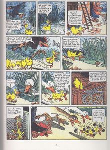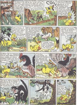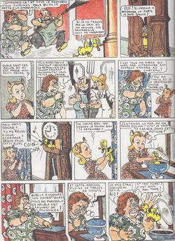 remarques: | édition Glénat dans la collection Patrimoine BD, 62 pages, tout en couleur, grand format reprend quelque peu Oscar à la campagne par les éditions SPE, soit 49 pages publiées dans FILLETTE en 1946 et 1947 + 9 pages sur l’œuvre de MAT 1/ biographie d'Oscar créé en 1941 dans le journal Fillette édité par SPE, un univers charmant de fantaisie/humour avec Oscar le petit canard, Josette sa jeune maîtresse et tante Zulma des Entournures arrêté par la guerre, le journal Fillette est réédité en mai 1946 en reprenant les aventures d'Oscar dès le début en 1941, une série de 19 cahiers brochés débutent en 1948 permettant d'élargir son lectorat (dernier cahier no 19 en 1963) >> pour les cahiers >> voir sous récits complets les aventures d'Oscar continueront dans le journal de Bibi Fricotin jusqu'en 1972 (mais en moins bonne qualité), Mat décède en 1982 à l'âge de 87 ans dans les aventures d'Oscar, le but de Mat n'est que de crééer un plaisir pour rire de bon coeur avec les facéties des aventures d'Oscar, mais si les scénarios n'ont rien exceptionnels à part les calembours et autres jeux de mots, le graphisme est superbe du moins dans les 10 premiers épisodes 2/ - reprise des premières aventures d'Oscar pages publiées dans les 50 premiers numéros de Fillette entre 1946 et 1947 (le premier cahier paraissant en novembre 1949); le physique d'Oscar n'est pas encore affiné, mais le coloriage est déjà bien exécuté malgré quelques pages de l'album plutôt ratées >> p. 36 apparition de Josette >> p. 37 apparition de tante Zulma cet épisode d'album reprend exactement le contenu du cahier no 1 d'Oscar + 5 pages du cahier no 2 Oscar au cirque mais le coloriage, bien que toutes les pages soient en couleur (les cahiers étaient 50% couleur et 50% noir&blanc) est moins bien exécuté par rapport aux éditions originales de 1946 et 1947 3/ - biographie de MAT = Marcel Turlin, 1895-1982 premiers travaux comme dessinateur en 1917 dans "le pays", puis collabore au canard enchaîné, le petit parisien, le dimanche illustré, Paris-Soir, etc en 1922, début dans la BD avec "les joyeux petits Lustucru" pour la SPE = Société Parisienne d'Edition des frères Offenstadt avec qui il collaborera jusqu'à sa retraite en 1972, il aura été à la fois dessinateur et scénariste il fut l'ami de plusieurs dessinateurs d'avant-guerre tel que Marcel Arnac, Forton, Thomen, Giffey, Jo Valle et José Morelli Mat créa une multitude de personnages dont les plus fameux: - 1930 Pitchounet, fils de Marius dans Ric et Rac, puis dans le Journal des Pieds Nickelés - 1934 César-Napoléon Rascasse dans l'Intrépide AVG - 1934 Laurel et Hardy dans Cri-Cri et dans l'As - 1936 professeur Soupe dans Junior - 1941 Oscar le petit canard dans Fillette, puis dans Journal de Bibi Fricotin - 1947 Baby Balluchon dans Coq Hardi - 1948 le père Latignasse dans le journal des Pieds Nickelés - 1948 Boubou, le petit éléphant dans Baby Journal et Cri-Cri - 1948 Filmette dans le magazine Film Complet - 1948 Tétar-Zan dans l'éphémère journal l'Epatant APG - 1952 Bouclette la jeune orpheline pour les éditions Rouff - 1952 Bamboula le petit nègre pour les éditions Rouff - 1956 Charlot repris de Thomen dans Pschitt Joyeuse Lecture - 1952 Viviane la jeune éclaireuse pour les éditions Rouff - 1967 le brigadier Sagace dans les Pieds Nickelés Magazine - 1967 Spa-Râ-Drâh (sa dernière création) >> un album d'étude sur les oeuvres de Mat, assez bien conçu et plutôt détaillé, probablement un des seuls livres d'étude sur Mat annexes - couverture de l'album et extraits |