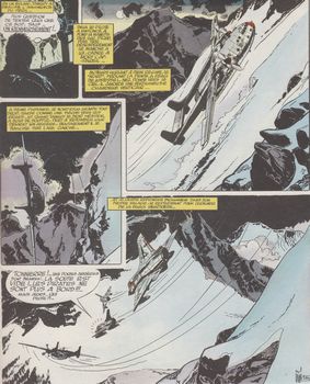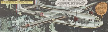 remarques: | la suite des "vampires attaquent la nuit" avec un récit prolongé à 56 pages (au lieu des conventionnelles 48 pages), dernier titre: un DC8 a disparu Tanguy embarque avec un équipage et la rançon à bord d'un Noratlas à destination du rendez-vous des pirates, suivi par une escadre de 700 paras >> p. 5 un superbe Noratlas >> p. 6 la Suisse est le pays rêvé pour le payement d'une rançon le Noratlas est sommé d'atterrir dans le Jura près de Pontarlier, mais les pirates prennent de court leurs poursuivants en redécollant peu après et en larguant les containers qui contiennent la rançon dans un lac près des Alpes après avoir brouillé leur route les pirates sautent peu après en parachute en abandonnant Tanguy dans le Noratlas, celui-ci réussira néanmoins à atterrir en catastrophe sur un plateau enneigé le plan du vampire a réussi mais se sentant trompé, il déclanche le plan de représailles no 1 >> p. 28 la colère du vampire >> p. 34 les représailles du vampire entretemps, Tanguy a mené une enquête personnelle et découvre le lac où ont été largués les containers et par la suite la base principale des pirates: un vieux château transformé avec un observatoire astronomique camouflant un puissant radar et une piscine qui se vide et sert de piste d'atterrissage pour leurs avions VTOL (décollage vertical) >> p. 38 le vieux comte rend encore bien des services >> p. 39 une base admirablement camouflée: un hangar secret, ménagé sous le double-fond de la pièce d'eau n.b. les moyens techniques des pirates sont vraiment une prouesse (c'est un peu "gros" mais bien imaginé) en s'infiltrant dans la base, Tanguy met la main sur une carte mentionnant la position de toutes les bases des pirates en France et donne l'alerte générale et la dernière tentative du vampire se solde sur un échec, toutes les bases seront détruites et lui-même réfugié sur un pétrolier-porte-avions périra dans les flammes de l'enfer, force restant au gouvernement français de Pompidou >> toujours un très bon scénario mais l'effet du premier volume est quelque peu atténué, le graphisme restant toujours bien élaboré annexes - couverture de l'album - extrait de page - le Noratlas en pleine action |