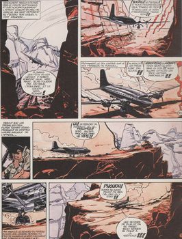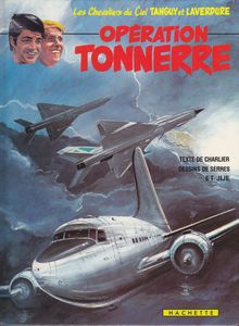remarques: | dernier titre: opération tonnerre, 48 pages cet album Hachette/Korallee mentionne pour la première fois au premier plat les portraits des deux chevaliers la suite des aventures africaines des deux chevaliers qui au retour de leur expédition au Tibesti sont sur le point d'être arrêtés par les autorités tchadiennes qui ne sont pas d'accord sur les transactions menées avec les rebelles de Hassan Koubré nos amis comprennent qu'il y a un traître parmi eux, mais ne peuvent pas encore l'identifier >> p. 12 on répare les dégâts causés avec du chewing-gum et l'humour de Laverdure à ce sujet l'avion est dérouté vers Bangui puis vers Lomé pour continuer l'opération de sauvetage de Muriel Aspern qu'il faut pouvoir libérer dans les prochains 6 jours, l'avion à Lomé est chargé de carburant, d'armes falsifiées et autres utilités avec par la même occasion une équipe de barbouzes qui font partie du voyage chargés de la libération de Muriel Aspern à la base des rebelles pendant que Tanguy et Laverdure détourneront l'attention des rebelles en livrant les armes >> p. 20 le libanais Farakian, marchand d'armes >> p. 26 un Tanguy quelque peu injuste les 10 baroudeurs sont parachutés à 10 km du lieu de rendez-vous pour libérer Muriel Aspern dans sa cachette, le rendez-vous est fixé sur le lac de sel de Kilina, mais le traître se démasque, c'est Natacha Kramer (nom de code Cobra 3) qui communique à un commando étranger le plan de Tanguy et Laverdure le commando ennemi fonce alors vers le lac Kilina, mais Tanguy réussit à faire décoller son avion juste avant leur arrivée, toutefois il faut malgré tout récupérer les baroudeurs qui ont réussi à libérer Muriel Aspern, de plus il reste le mystérieux personnage masqué a réussi à s'introduire et à se cacher dans l'avion de Tanguy lors de la deuxième rencontre avec Hassan Koubré >> p. 34 les frankaouis déroulement final dans le prochain album >> un bon scénario avec suspense et action soutenue, une formidable équipée avec un commando de choc dans le Tibesti (semblable quelque peu au raid israëlien sur les otages de Amin Dada) et toujours un bon graphisme de Jijé en collaboration avec le dessinateur Patrice Serres (50% Jijé, 50% Serres), également un bon coloriage et un graphisme qui ressemble quelque peu à celui de Milton Caniff Information - référence de Hassan Koubré avec Hissène Habré (1942-2021), président de la république du Tchad de 1982 à 1990, issu d'un clan du nord, il rejoint les rebelles du Frolinat contre le gouvernement tchadien dominé par le sud dans la première guerre civile tchadienne, en raison d'une rupture avec Goukouni Oueddei, un autre commandant rebelle, Habré et son armée rebelle les Forces armées du Nord (FAN) s'allient brièvement avec le gouvernement de Felix Malloum avant de se retourner contre ce dernier, sous les termes des Accords de Lagos en 1979, Malloum démissionne et Habré est nommé ministre de la Défense dans le Gouvernement d'union nationale de transition (GUNT) avec Oueddei comme président, leur alliance s'est effondrée rapidement, menant à une deuxième guerre civile qui s'achève en 1982, quand les forces de Habré renversent Oueddei - devenu le nouveau président du Tchad, Habré impose une dictature à parti unique gouvernée par son Union nationale pour l'indépendance et la révolution (UNIR), sous laquelle le pays éprouve une violation généralisée des droits de l'homme, il reçoit le soutien de la France et des États-Unis tout au long de son régime en raison de son opposition au dirigeant libyen Mouammar Kadhafi, il dirige le pays pendant le conflit tchado-libyen, aboutissant à la victoire en 1987 dans la guerre des Toyota avec le soutien français, il est renversé en 1990 par un coup d'État fomenté par son ancien général Idriss Déby et s'enfuit en exil au Sénégal |
