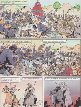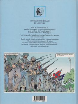 remarques: | série historique intéressante sur la guerre de Secession américaine 1861-1865, la Confédération (11 états: Arkansas, Alabama, Caroline, Floride, Georgie, Louisiane, Maryland, Mississipi, Tennessee, Texas et Virginie) contre l'Union (les fédérés des états du nord), qui économiquement plus fort remporta cette guerre dirigée par le président Lincoln jusqu'à sa mort assassiné le 14.4.1865 dans un théâtre de Washington les nombreuses batailles dont celles de Bull Run, Siloh, Antietam, Fredericksburg, Vicksburg et Gettysburg durant laquelle les confédérés perdirent l'offensive de la guerre et qui peu après causa leur défaite le raid éclair du général Sherman depuis Chattanooga au Tennesse jusqu'à Savannah en Georgie via le siège d'Atlanta le 9 avril 1865, le général doit signer la reddtion à Appomatix Court House >>> un album bien constitué autant pour le scénario que pour le graphisme |