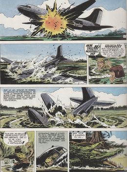 remarques: | 48 pages, dernier titre: station brouillard suite et fin de l'épopée Tibesti, le nouveau plan de Tanguy: lancer le commando de Natacha à la rencontre des 10 baroudeurs qui devront les éviter et rejoindre le plus rapidement possible le lac de Kilina pour être récupérés par Tanguy et l'inimaginable arrive: dans une nuit noire, le commando étranger rencontre les rebelles de Koubré à la poursuite des 10 baroudeurs et les deux forces ne se reconnaissant pas s'affrontent l'une contre l'autre grâce à cette diversion, Tanguy réussira à récupérer tout le monde, mais il reste le mystérieux personnage dissimulé dans l'avion dès son départ toutefois, l'avion de Tanguy en manque de coco (= carburant) ne peut plus atteindre l'aéroport de Bangui et doit se poser sur le lac Tchad, mais auparavant le mystérieux personnage masqué se démasque, c'est Shebarrazzi, une agent libyenne de Kaddhafi, qui veut s'emparer de Muriel Aspern, elle prend le contrôle de l'avion et détache Natacha pour la prendre comme complice >> p. 13 une Natacha bien ficelée lors de la descente sur le lac Tchad, Shebarrazzi force Muriel à sauter avec elle dans le lac et en sortant lance une grenade à l'intérieur de l'avion, tous les passagers y compris Natacha meurent dans l'explosion, seuls Tanguy et Laverdure protégés dans le cockpit échappent à la mort >> p. 31 après les rebelles du désert, les crocodiles du lac Tchad Shebarrazzi avec Muriel comme otage s'empare d'une voiture et contacte un autre agent libyen au Cameroun (de l'autre côté du lac) pour venir la récupérer avec son otage, mais après quelques péripéties, Tanguy et Laverdure à l'aide d'un hélicoptère réussiront à rejoindre Shebarrazzi, et après une lutte finale, à délivrer définitivement Muriel Aspern tout en détruisant la base libyenne dans laquelle Shebarrazzi périra >> p. 48 une fuite plutôt spectaculaire >> un scénario avec quelque suspense malgré une fin précipitée, de nombreux rebondissements et un graphisme respectable de Serres pour son premier album paru après deux autres album retro sur Tanguy et Laverdure sans grand intérêt |