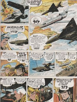 remarques: | édition Hachette/Novedi, curieusement seulement 47 pages, dernier titre: l'espion venu du ciel Tanguy et Laverdure de retour à Air Delta pour donner leur démission, mais la disparition du capitaine Fourreau en mission en Afrique remet tout en question et voilà les deux chevaliers partis pour une nouvelle mission vers l'état de Kombola (similitude avec l'Ouganda) avec Sethy-Neudize, directeur du personnel et les deux mécanos Hurel et Boirot ainsi que d'un soi-disant croque-mort: le gai Legay tout ce monde doit récupérer le corps de Fourreau à Kombola où règne le dictateur-colonel Ojumbé, un nouveau Amin Dada et son chef de sécurité Kundélé, mais l'avion piloté par Tanguy est doté d'un équipement électronique ultra-moderne camouflé dans le ventre de l'avion afin de trouver une base secrète camouflée dans une zone interdite du Kombala >> p. 7 le nouvel avion de Tanguy et Laverdure: un Super Falcon 50 >> p. 7 le mécanicien Casimir Boirot qui est appelé Joe Dalton de par sa ressemblance avec celui-ci >> p. 12 un croque-mort qui s'appelle Legay, c'est le bouquet >> p. 16 les propos déplacés de Tanguy sont quelque peu de mauvais goût atterrissage à Lumbashi où ils sont aussitôt arrêtés par la police d'Ojumbé et leur avion séquestré, négotiations avec Ojumbé, mais la mystérieuse conseillère d'Ojumbe, miss Li-Ling, un agent chinois, se méfie beaucoup de Tanguy le président-dictateur veut tester son nouvel avion et Tanguy en profite pour faire des photos sur les territoires survolés >> p. 32 un juron de Tanguy: Tudieu de retour à leur hôtel, ils sont contactés secrètement par Malika, fiancée de Fourreau qui remet à Tanguy une calculatrice de poche qui mentionne une mystérieuse fréquence radio (121-8) nota bene: - 3 noms sont mentionnés pour l'aéroport de Kombola: Mombashi, Lumbashi et Kumbashi - les noirs ne sont pas considérés très favorablement dans cet album (racisme?) >> le récit reprend quelque peu le thème de l'opération tonnerre avec référence à Amin Dada et avec une caricature plutôt incongrue de Joe Dalton, le texte n'est pas terrible mais reste intéressant et Serres se débrouille très bien avec le graphisme qui reste respectable (toujours genre Milton Caniff) avec un très bon coloriage |