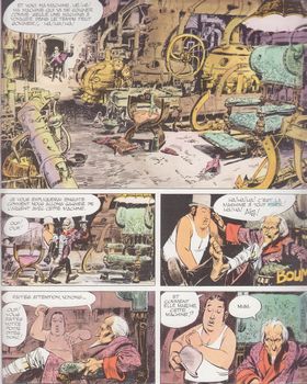remarques: | album de 64 pages, dédicacé par Fred avec dessin thème du voyage dans le temps, un colporteur, Timoléon, fait du porte à porte pour vendre sa machine à vapeur pour rouler les cigarettes, mais arrivé chez le prof Stanislas, celui-ci lui propose une association pour gagner de l'argent avec le temps en voyageant dans le temps avec sa machine à remonter le temps pour acquérir dans le passé des objets qui prendront de la valeur avec le temps >> p. 3 la machine à vapeur pour rouler des cigarettes de Timoléon >> p. 9 et 40 la machine à remonter le temps du prof Stanislas Timoléon est envoyé dans le XVème siècle par le prof Stanislas pour se procurer le tableau de la Joconde par Leonardo Da Vinci, mais le tableau n'existe pas encore, car Leonardo ne s'est pas encore mis à la peinture artistique >> p. 19 Mona Lisa à Florence >> p. 30 l'expression chère à Fred: ah là là là >> p. 37 la fameuse banane dont la peau sera l'instrument de la fatalité en faussant complètement les projets du prof Stanislas >> p. 42 on remonte le temps en restant dans le présent (la jambe cassée n'est plus cassée, mais le bandage subsiste) le reste de l'album ne sera plus que des retours dans le passé où Stanislas se rencontrera jeune inventeur et petit enfant avec sur toile de fond la fameuse peau de banane qui ne le quittera plus on tourne en rond dans le passé et comment faire marcher la machine du passé au présent à présent >> un graphisme bien concu avec une couverture intéressante et un scénario d'une certaine originalité raconté à la Fred d'une façon très fantasmagorique, mais le coeur y est, même si le thème du voyage dans le temps est bien connu et souvent dé(passé) mais le tout reste plutôt amusant |