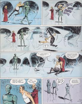 remarques: | album de 62 pages, dédicacé par Fred avec dessin premier épisode après les voyages dans le passé, le prof Stanislas se lance dans les voyages dans le futur et nos deux amis échouent en 5971 sur une machine à voyager dans le temps en route pour l'année 7897, toutefois dans le futur, on ne peut plus voyager dans le passé, la date extrême pouvant être atteinte dans le passé se situe au 43ème siècle >> p. 16 les motards du temps arrêtés comme clochards, les deux amis sont mis en prison temporelle >> p. 24 les cellules lumineuses mais n'étant pas enregistrés dans le futur, ils ne sont plus surveillés et peuvent quitter la prison, après quoi ils rencontrent encore les maîtres = fabricants de machines à voyager dans le temps, et finalement malgré >> p. 38 les bouchons temporels dans la circulation du futur les deux hommes du XIXème siècle réussiront à regagner leur lieu de départ (grâce surtout à l'imagination de Fred) deuxième épisode suite à une décharge de foudre, la machine à remonter le temps du prof Stanislas se détraque et se met en marche toute seule vers le passé, elle atteint l'ère jurassique et ramène un brontosaurus qui avant d'être rejeté dans le passé laisse dans le présent un oeuf géant qui permettra à Timoléon de confectionner plusieurs omelettes >> ce deuxième volume est moins recherché que le premier pour le scénario, le deuxième épisode restant un intermède et un classique du genre, seul le graphisme est vraiment intéressant |