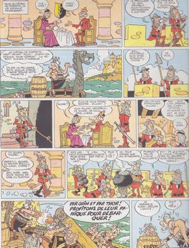 remarques: | un album 1er trimestre 1974, 62 pages avec 9 épisodes d'histoires charmantes 1) la rentrée des classes (Charlemagne) tout empirait dans l'Empire d'où création des écoles, la récréation, les carnets scolaires, les épreuves, les punitions, les examens, la distribution des prix, etc les noms qui finissent en x au pluriel (bijou, caillou, genou, hibou, joujou, pou) qui proviendraient d'une liste des objets confisqués en classe 2) le tricot de l'empereur (les nouilles) Chine, Tchao-Tchao le cuisinier de l'empereur invente pour remplacer le riz le plat de nouilles qu'on mange en tricotant avec des baguettes 3) Robinet des bois le jeune Gontran de Ragout surnommé le Robinet des bois qui essaie d'égaler le véritable Robin des bois 4) Eskif le frêle (l'importance du thé) les invasions des vikings menés par le chef Grolar l'excité qui s'en prennent aux soldats anglais du baron de Pomfryth, Grolar, fait prisonnier, sera délivré par Eskif le frêle et tous les deux fileront à l'anglaise >> p. 21 le phlegme anglais 5) entracte (une histoire d'esquimaux) la famille Granduk: Perruk, Mameluk, Volapuk et Petitruk qui lui veut jouer de la flûte au lieu de partir à la chasse comme ses frères, finalement Petitruk ira chasser à la musique >> p. 29 au Pôle 2 jours et 2 nuits = 2 ans >> p. 33 le cri du morse 6) les deux mousquetaires sous Louis XIII et Richelieu, les gardes du cardinal et les mousquetaires du roi se lancent un duel et c'est le mousquetaire Dubois qui remplacera d'Artagnan pour une mission de nougat à Montélimar 7) sans rime ni raison (au Moyen Age), dans la série des légendes féériques; les deux poètes Baliverne et Anicroche veulent tous deux marier la princesse Hypophyse et pour les départager, ils sont soumis à des épreuves qu'ils réussiront, mais quand ils apercoivent la laide princesse, tous les deux prennent la fuite et pour échapper à la princesse, ils se transforment en poireau grâce à leur voeu magique 8) l'affaire des contrepoisons Renaissance, Italie, Leonardo da Vinci >> p. 46 les seigneurs Pericoloso Coriza et Andante Manontropo pour annuler les effets d'un terrible poison administré à Coriza, il faut trouver un contrepoison obtenu par le lait d'une vache nourrie exclusivement de trèfles à quatre feuilles 9) la route des épices (conquistadores) les expéditions aux Indes et au Mexique par le seigneur Pedro de Obras y Carretera qui découvrira les secrets de la cuisine aztèque: au poivre flambé ou au steak poivré >> épisodes parus dans le Journal Pilote, les scénarios sont concoctés par Goscinny qui comme toujours excelle dans ce genre de récit avec moû calembours et autres jeux de mots et le graphisme de Martial est tout à fait agréable à la lecture >> seul et unique album de ce genre n.b. Martial alias Martial Durand, 1925-2013 bibliographie: - Monsieur Sait-tout - la famille Bottafoin - Sylvie, Tony Laflamme - Jérôme Bluff et histoires de l'Oncle Paul Information les divagations de M. Sait-Tout est une bande dessinée humoristique créée par Martial et René Goscinny parue dans Pilote entre 1961 et 1965, elle se compose de 9 récits complets totalisant 50 planches s’il n’est pas présent dans le premier numéro de Pilote, Martial a néanmoins été associé au projet, Goscinny et Martial se connaissant depuis le début des années 50, ils ont déjà travaillé ensemble sur Sylvie + Alain et Christine pour la World Press l’une des caractéristiques de Pilote à l’’époque est d’offrir davantage de récits complets dans ses pages que ses concurrents, mieux encore quand Tintin ou Spirou offrent des récits complets, ceux-ci sont de 4 pages tandis que Pilote peut proposer jusqu’à 8 planches, d’où des histoires plus étoffées et mieux construites, enfin, le plus souvent ces récits complets sont chez Tintin et Spirou des anecdotes historiques tels les récits d’Yves Duval ou les fameuses histoires d’Oncle Paul Pilote ne délaisse pas l’aspect historique et va d’ailleurs régulièrement proposer un équivalent, à ceci près qu’il ne s’agit pas de BD, mais de textes sous des vignettes, dès le départ Pilote fait le choix d’avoir majoritairement des récits complets de pur amusement, bien qu’un décompte précis n’ait pas encore été fait, les bandes humoristiques composent plus des 2/3 de ces histoires bien qu’il s’en soit officiellement défendu, les divagations de M. Sait-Tout furent une parodie des belles histoires de l’Oncle Paul et surtout un excellent prétexte pour Goscinny de faire des jeux de mots, la chose nous parait évidente aujourd’hui grâce à Iznogoud, mais à l’époque, le fameux vizir n’existait pas encore, il sera créé un an plus tard (1962) pour le périodique Record comme pour l’épopée bagdadie le nom des personnages baigne dans l’à-peu-près et le calembour: un cuisinier chinois est nommé Tchao Tchao, un Aztèque Talaquétzaouti, le fourbe Pericoloso Coryza et le bon Andante Manontropo, lady Pomfryth, etc mais cet humour ne se limite pas aux noms des personnages ainsi tel viking s’exclame: je suis tombé par terre, par Thor, ce qui caractérise cette BD, outre ses jeux de mots, est l’anachronisme voulu, ainsi à titre d’exemple un seigneur médiéval juché sur son cheval s’adresse à un paysan: quel champ puis-je piétiner aujourd’hui, Mathieu? allez piétiner les betteraves, sire, il y a surproduction, ça risque de faire baisser les prix on découvre des scènes qui seront reprises ou amplifiées par la suite dans d’autres réalisations de Goscinny, les anglais qui font par exemple une pause pour le 5 o’clock tea préfigurent les bretons d’Astérix bref, on le voit ces divagations furent un laboratoire, un essai, brillant au demeurant, pour de futures œuvres le succès d’Astérix fit que Dargaud en profita pour éditer enfin ces aventures en 1974, Martial écrivit alors à Goscinny en lui demandant de reprendre 